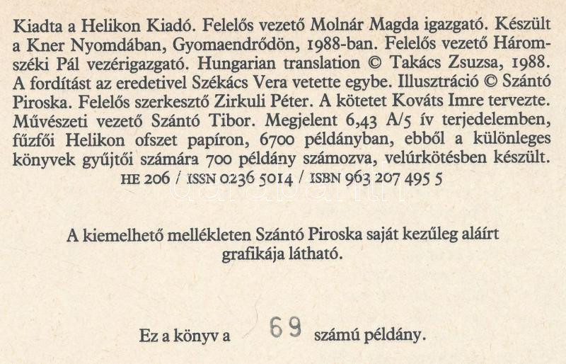 Keresztes Szent János: A lélek éneke. Ford. és az utószót írta Takács Zsuzsa. Bp.,1988, Helikon, 59+5 p.+4 t.+1 (Szántó Piroska saját kezűleg aláírt grafikája) t. A borító és illusztráció Szántók Piroska munkái. A grafikus, Szántó Piroska (1913-1998) által DEDIKÁLT példány. Kiadói bársony-kötés, kiadói papír védőborítóban. Számozott (69./700) példány!