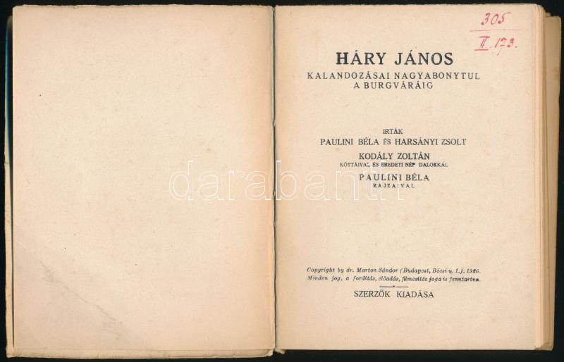 Paulini Béla - Harsányi Zsolt: Háry János kalandozásai Nagyabonytul a Burgváráig. Kodály Zoltán kottáival és eredeti nép dalokkal. Paulini Béla rajzaival. Bp.,1926., Szerzők, (Budapesti Hirlap-ny.),109 p. Első kiadás! Kottákkal, rajzokkal gazdagon illusztrált. Kodály Zoltán Háry János c. eredetileg öt kalandból álló, 1926-ban, a Magyar Állami Operaházban bemutatott operája. Kiadói illusztrált papírkötés, kissé kopott borítóval, a gerincen és a borítón apró szakadással.