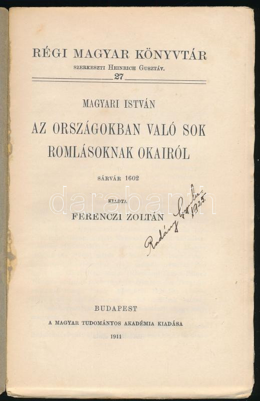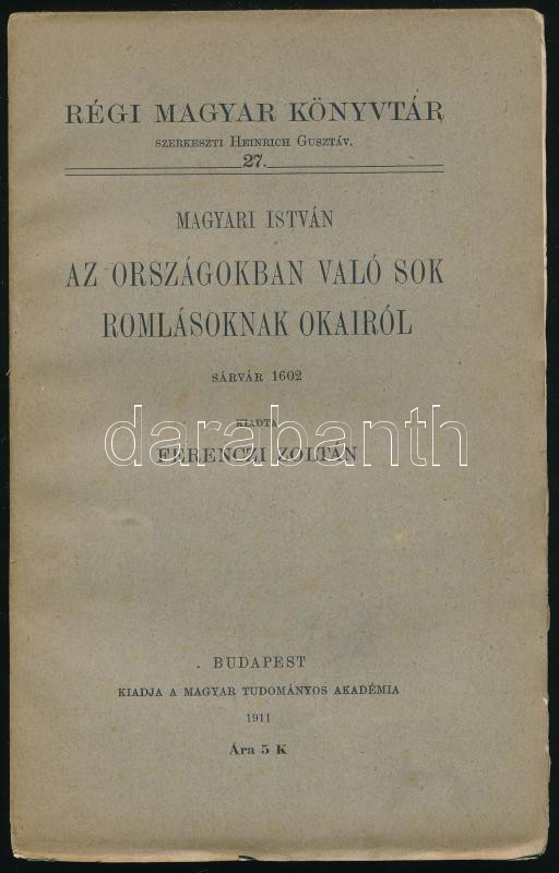 Régi Magyar Könyvtár 27. köt.: Magyari István: Az országokban való sok romlásnak okairól. Sárvár 1602. Kiadta Ferenczi Zoltán. Bp., 1911, MTA. Kiadói papírkötés.