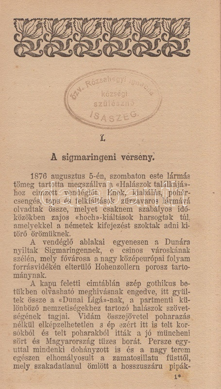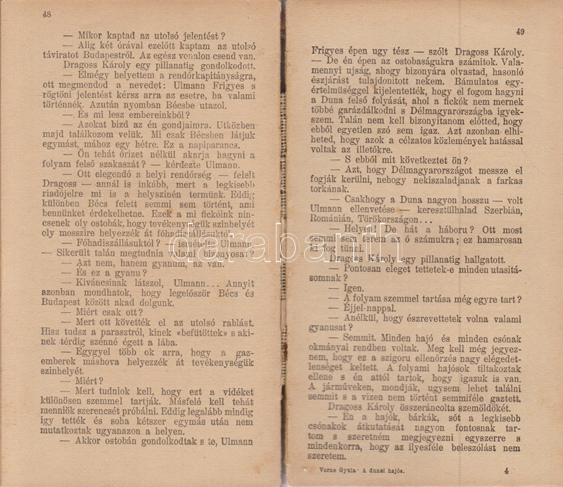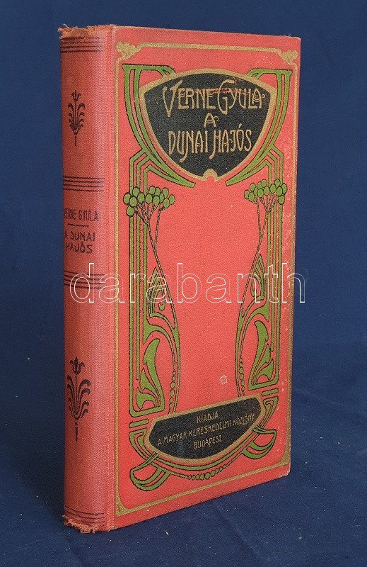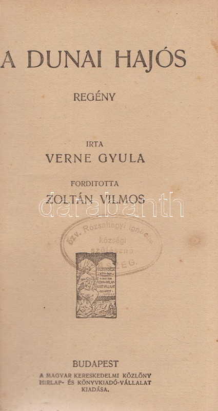 Verne, [Jules] Gyula: A dunai hajós. Regény. Fordította Zoltán Vilmos. Budapest, [1910]. Magyar Kereskedelmi Közlöny Hírlap- és Könyvkiadó Vállalat (Pallas Rt. ny.) 160 p. Verne Gyula dunai kalandregénye eredeti nyelven először az író hagyatékából jelent meg, 1908-ban, Le Pilote de Danube címmel, példányunk a Magyar Kereskedelmi Közlöny által kiadott fordításból való. Zoltán Vilmos Verne-fordítása később az Érdekes Újság kiadásában ,,Hat hét a Dunán" címmel is megjelent (Budapest, 1922). A címoldalon és a belív első nyomtatott oldalán régi tulajdonosi bélyegzés, példányunk fűzése enyhén meglazult. Poss.: özvegy Rózsahegyi Ignácné községi szülésznő Isaszeg településén. Aranyozott, festett kiadói egészvászon kötésben. Jó példány.