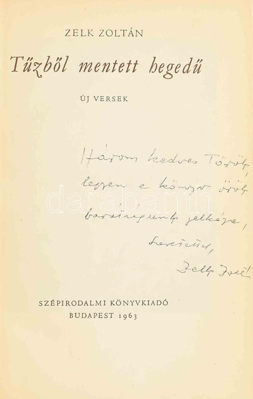 Zelk Zoltán: Tűzből mentett hegedű. A szerző, Zelk Zoltán (1906-1981) Baumgarten-, József Attila- és Kossuth-díjas költő, prózaíró által DEDIKÁLT példány és benne Zelk Zoltán autográf ugyan annak a személynek ("Három kedves Török,../ Kedves három Törökök!") levelével. Bp., 1963, Szépirodalmi Könyvkiadó. Kiadói egészvászon-kötés, kopott kiadói papír védőborítóban.