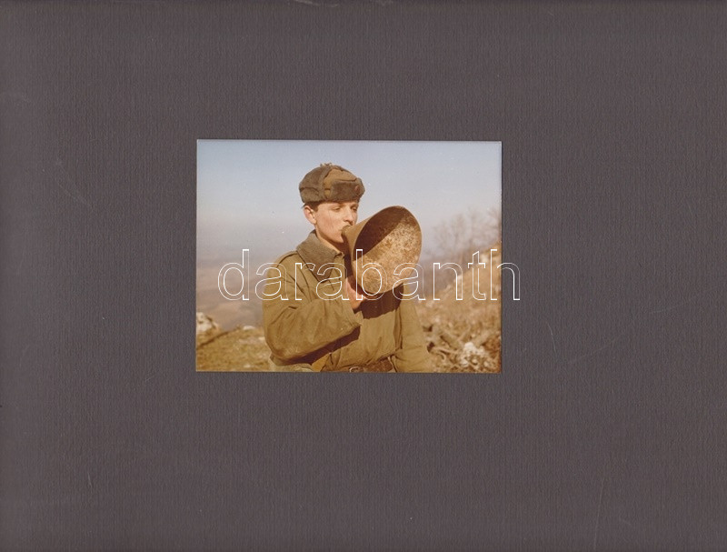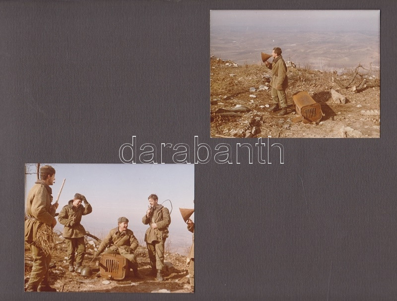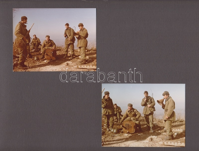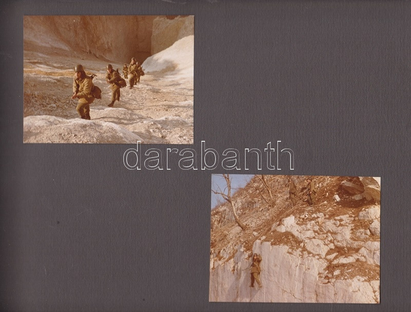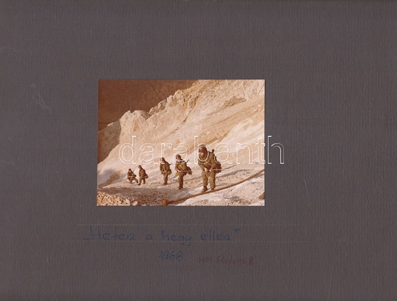A Huszárik Zoltán által ,,Heten a hegy ellen" címen rendezett színes katonai rövidfilm (1968) felvételei. A film operatőre, Simon György hagyatékából. [Budapest], 1968. Honvédelmi Minisztérium - Mafilm Katonai Studió. 48 fotóalbumoldalon 44 felragasztott fényképpel, ebből 35 színes. Haránt alakú album. A ,,Heten a hegy ellen" címmel rendezett színes katonai rövidfilm a legjobb operatőri munkának járó díjat nyerte a III. Nemzetközi Katonai Filmfesztiválon (Versailles, 1968). A korabeli kritika szerint a dialógusokat teljesen nélkülöző Huszárik-film mélyen emberi alkotás (Veszprémi Napló, 1968. szeptember 27.). A felvételek zöme a film jeleneteit ábrázolja, néhány stábfotóval kiegészítve. Az album 45 fotóval teljes. Zsinórral fűzött, feliratozott félbőr fotóalbum. Jó példány.