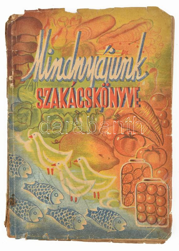 Mindnyájunk szakácskönyve. (Bp. 1949.) Magyar Nemzet. 96 l. A felsÅ‘ borÃtó hiányzik. Fűzve, kiadói borÃtékban. A kötet a recepteken túl a háztartárspénz beosztásához mellékel táblázatot, tanácsokat ad a betegek élelmezéséhez, Sérült papÃrborÃtóval Ritka