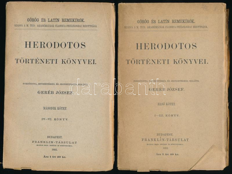 Herodotos történeti könyvei I. és II. kötet. Fordította, bevezetéssel és jegyzetekkel ellátta Geréb József. Görög és Latin Remekírók. Bp., 1892-1893, Franklin. Kiadói papírkötés, kissé sérült gerinccel, borító szélein apró szakadásokkal, felvágatlan példányok, I. kötetben lap széle kissé foltos. Csak az első és második kötet!