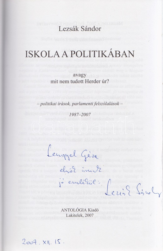 Lezsák Sándor: Iskola a politikában. Avagy mit nem tudott Herder úr? Politikai írások, parlamenti felszólalások 1987-2007. (Dedikált.) Lakitelek, 2007. Antológia Kiadó és Nyomda Kft. Dedikált: ,,Lengyel Géza elnök úrnak jó emlékül: Lezsák Sándor. 2007. XII. 15". Oldalszámozáson belül néhány szövegközti fényképpel illusztrálva. Kötetünk négy oldalán halvány aláhúzások. Prov: Lengyel Géza. [Lengyel Géza (1941-) költő, pedagógus, a Hitel folyóirat szerzője, összegyűjtött versei Rácsodálkozás címmel a dedikáció évében jelentek meg.] Fűzve, színes, illusztrált kiadói borítóban. Jó példány.