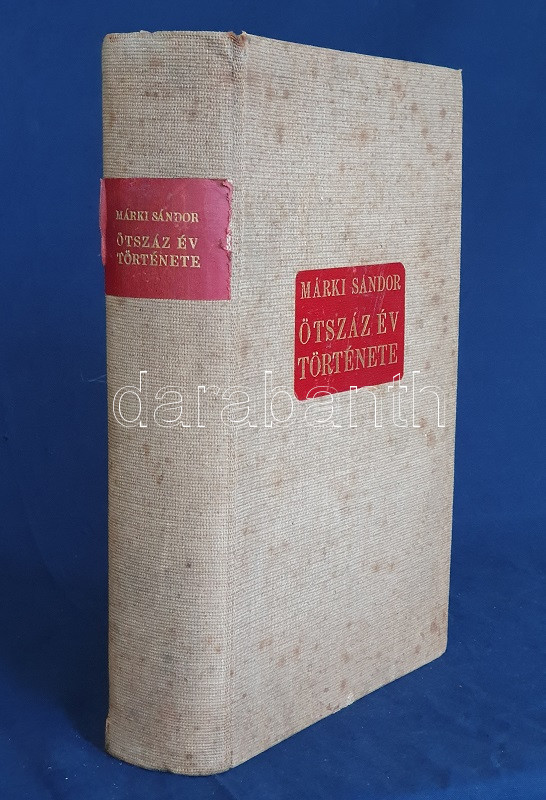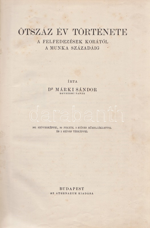Márki Sándor: Ötszáz év története a felfedezések korától a munka századáig. 361 szövegképpel, 30 fekete, 3 színes műmelléklettel és 1 színes térképpel. Budapest, [1910 körül]. Athenaeum (ny.) 704 p. + 33 t. (3 színes, 3 kihajtható) + 1 térkép (színes, kihajtható). Egyetlen kiadás. Oldalszámozáson belül gazdag szövegközti illusztrációs anyaggal. Enyhén sérült kiadói egészvászon kötésben, a gerincen és az enyhén foltos első kötéstáblán az aranyozott címfelirat vörös címkén, alul kissé foltos lapszélekkel. Jó példány.