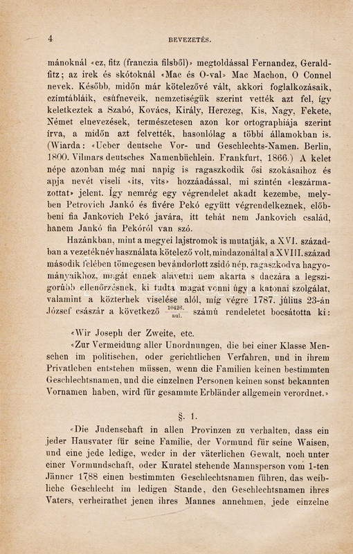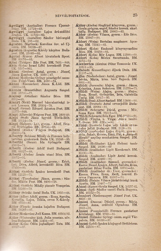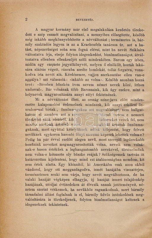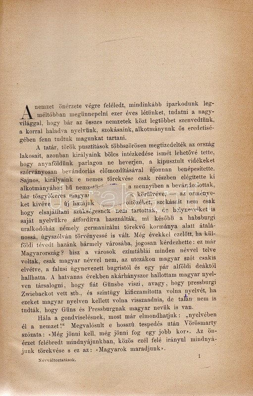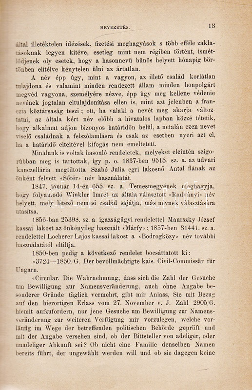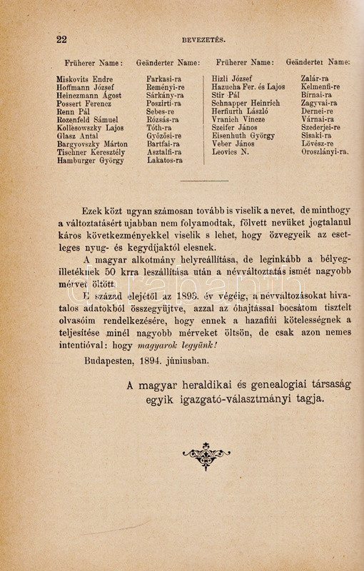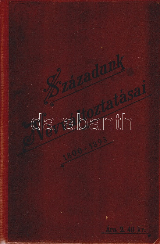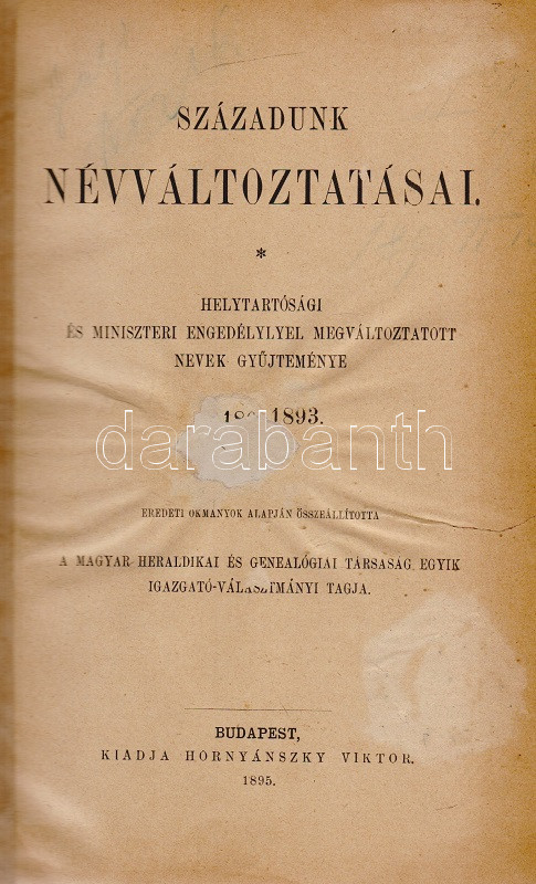 Századunk névváltoztatásai. Helytartósági és miniszteri engedélylyel megváltoztatott nevek gyűjteménye 1800-1893. Eredeti okmányok alapján összeállította a Magyar Heraldikai és Genealógiai Társaság egyik igazgató választmányi tagja. Budapest, 1895. Hornyánszky Viktor (ny.) 253 + [1] p. Első kiadás. Társadalomtörténeti szempontból emlékezetes gyűjteményünk a névmagyarosításban testet öltő 19. századi önkéntes asszimilációnak értékes dokumentuma. A rövid bevezető után a magyarosított családnevek alfabetikus sorrendben sorakoznak. Valamennyi változtatásnál adatolva: az eredeti családnév, a névváltoztatást igénylő lakhelye, számos esetben foglalkozása, gyermekei, valamint minden esetben a névváltoztatás engedélyszáma. A bekötött eredeti első borítón apró javítás, a címoldalon, illetve a belív három levelén kisebb sérülés, verzóján kisebb javítás. XX. század második feléből származó, aranyozott gerincű vászonkötésben, az eredeti első borító egyik változata az első kötéstáblára ragasztva. Jó példány.