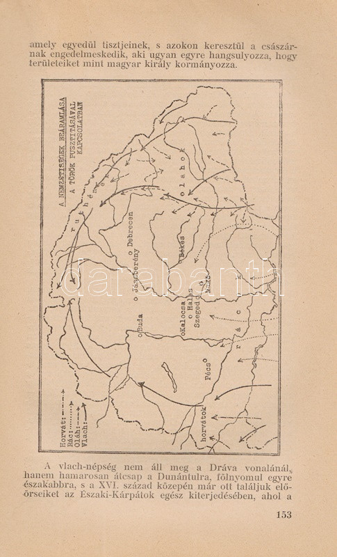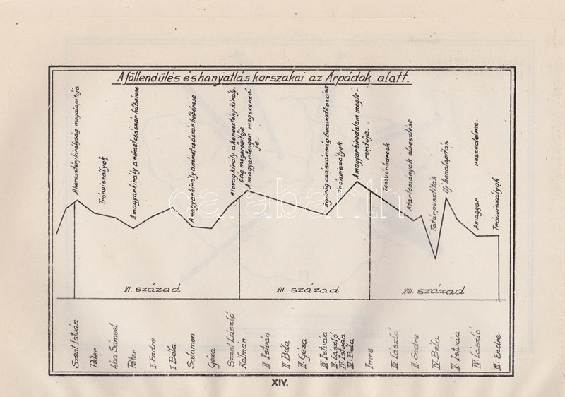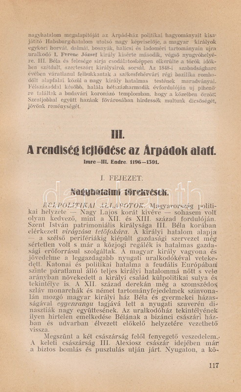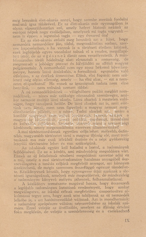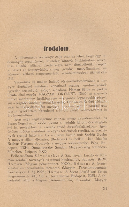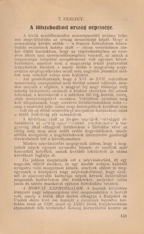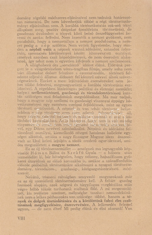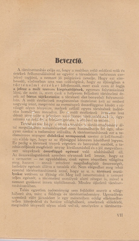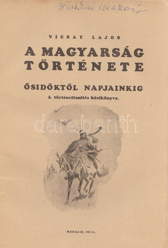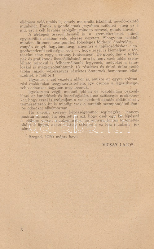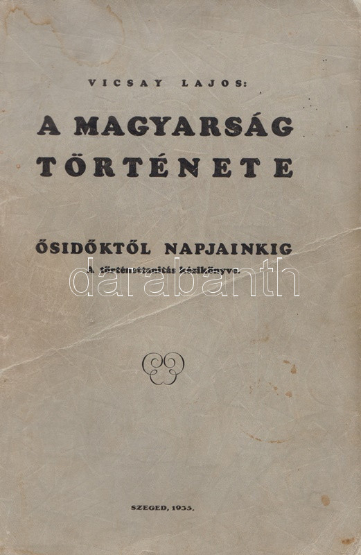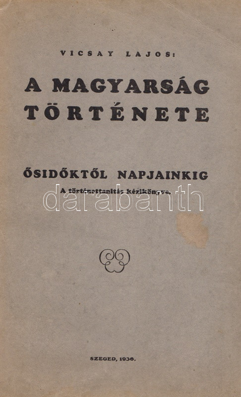 Vicsay Lajos: A magyarság története ősidőktől napjainkig. A történettanítás kézikönyve. I-II. kötet. [Teljes.] Szeged, 1935-1936. (Délmagyarország ny.) XV + [1] + 350 p. + 24 t.; [4] + 400 + [4] p. Vicsay Lajos történeti összefoglalója a Hóman-Szekfű-féle történelmi szintézist és annak történelemszemléletét vette mintának. Az oldalszámozáson belül számos szövegközti nemzetségtáblát és néhány hadműveleti ábrát tartalmazó munka főként politika- és eseménytörténettel foglalkozik, és szokatlanul korai időponttól (az Árpád-kortól kezdve) feltételezi a rendi társadalom jelenlétét. A mohácsi csatavesztéstől az 1930-as évekig tartó időszakot tárgyaló második kötet a politika- és eseménytörténet mellett markánsan megjeleníti a gazdaságtörténet, és rendező elvvé válik benne a demográfiai szemlélet - az országon belüli népesedési folyamatok és azoknak politikai következményei fontos témává válnak. A második kötetben oldalszámozáson belül néhány egész oldalas térkép. Az illusztrált címoldalakon régi tulajdonosi bejegyzés, példányunk fűzése laza. (A gyakorlati pedagógia könyvtára I-II. kötet.) Fűzve, egységes, sérült, enyhén foltos kiadói borítóban, a második kötet részben felvágatlan.