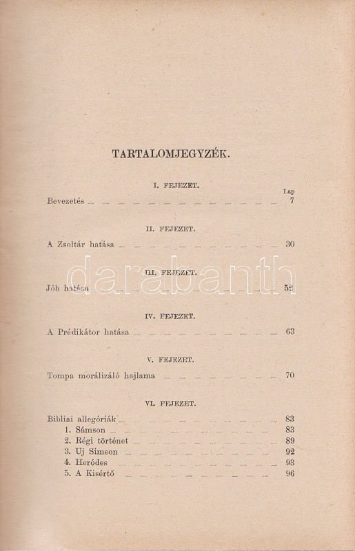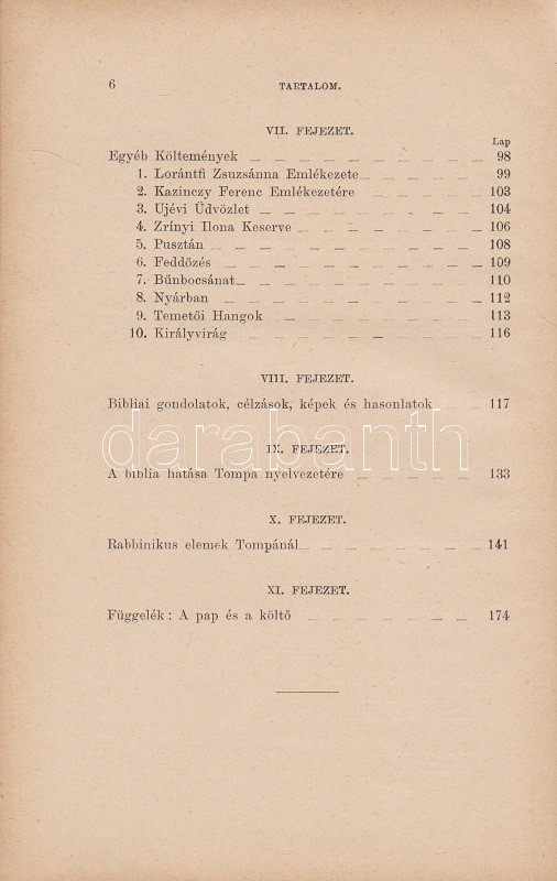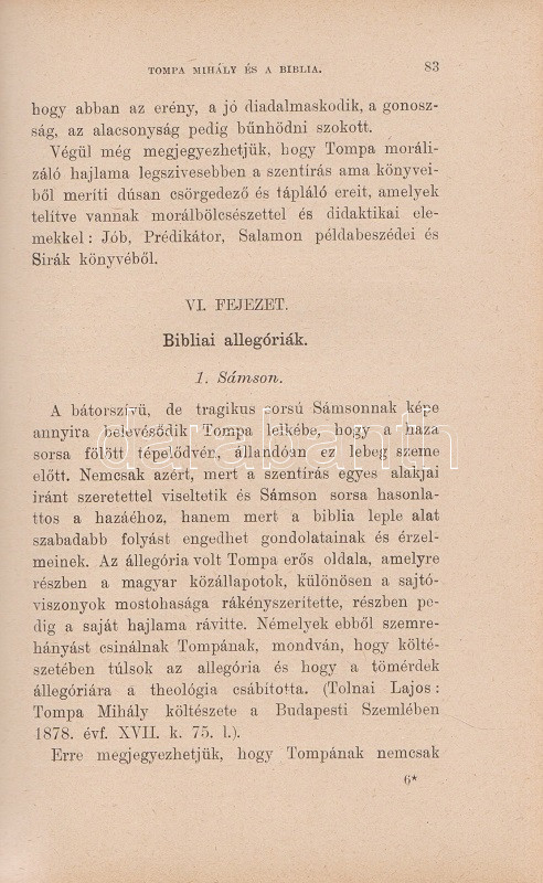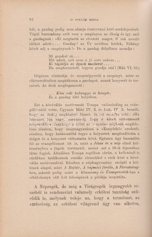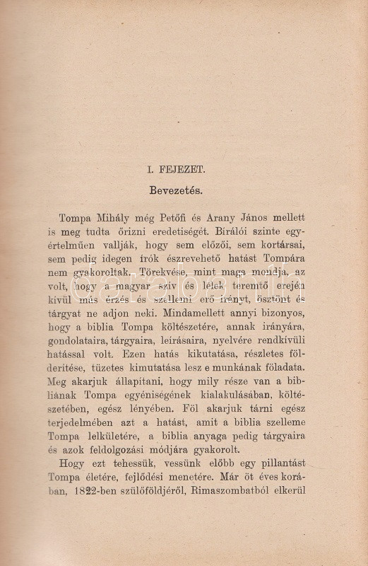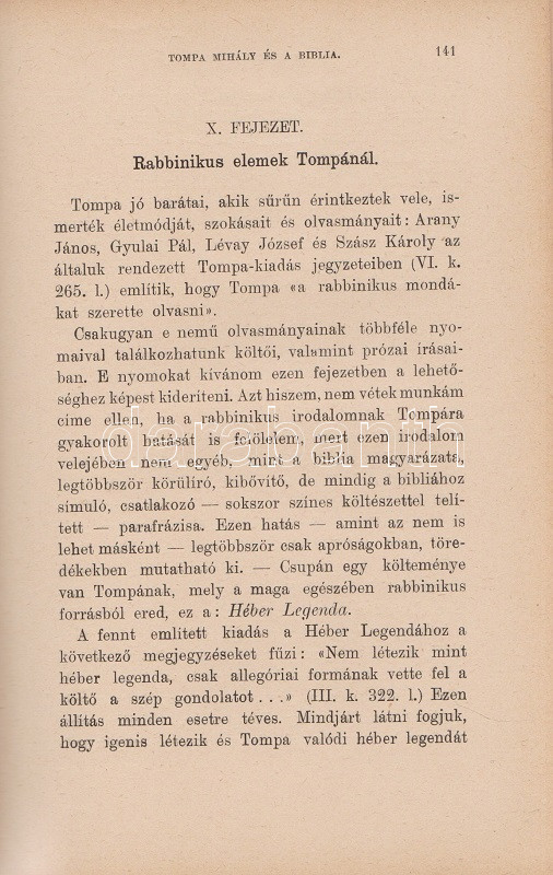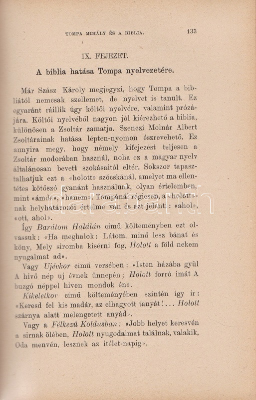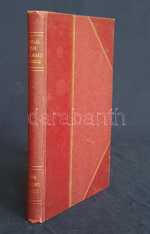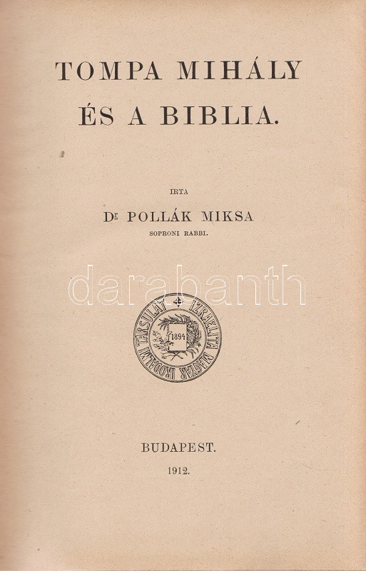 Pollák Miksa: Tompa Mihály és a Biblia. Budapest, 1912. Izraelita Magyar Irodalmi Társulat (Franklin-Társulat ny.) 194 p. Pollák Miksa filológiai munkájában Tompa Mihály költő és református lelkész költészetét vizsgálja, különösen szűk fókusszal. Pollák Miksa soproni rabbi Tompa költészetének ószövetségi ihletettségét mutatja ki az elemzett részekben. A korabeli kritika a munka egészének elismerése mellett így nyilatkozott a kötetről: ,,Csak a czélon kissé túllövő heureka-láz mondathatja ezt a szerzővel: ,,Ha sikerült kimutatnom a bibliának Arany és Tompára gyakorolt hatását, ezzel sikerült egyúttal kimutatnom a zsidó szellemnek a magyar néplélekre gyakorolt közvetett befolyását>>." (Kéki Lajos - Egyetemes Philológiai Közlöny, 1913, 419.) Aranyozott gerincű, korabeli félvászon kötésben, márványmintás festésű lapszélekkel. Jó példány.