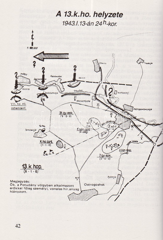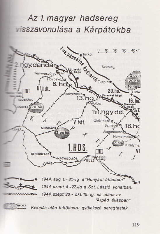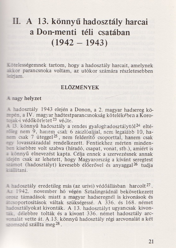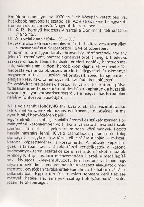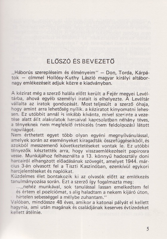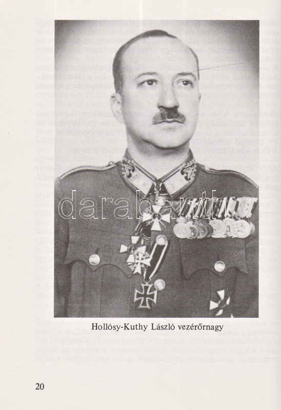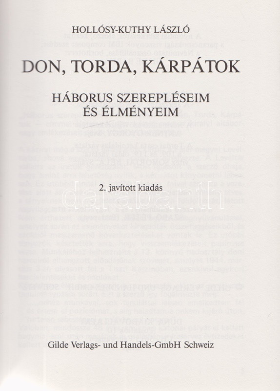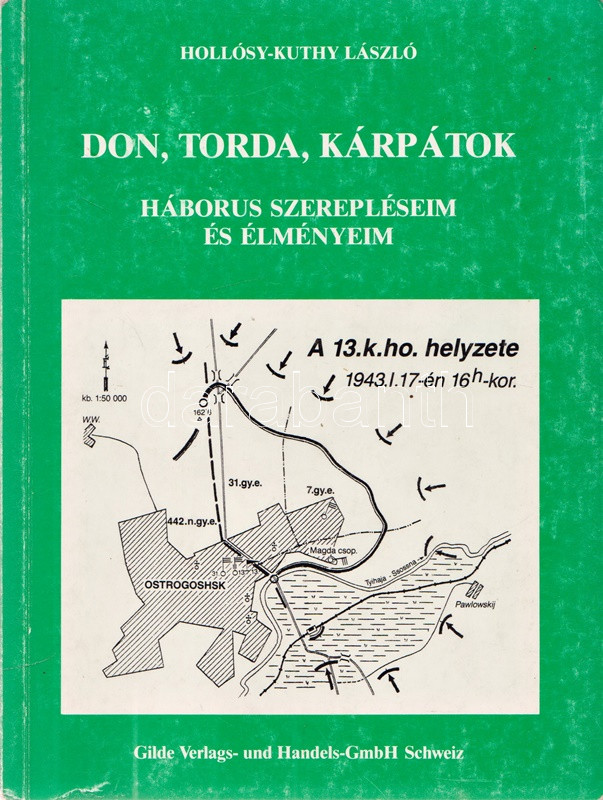 Hollósy-Kuthy László: Don, Torda, Kárpátok. Háborús szerepléseim és élményeim. (Sajtó alá rendezte, a bevezető tanulmányt és a jegyzeteket írta Szabó Péter.) (Fahrwangen, [1997]). (Duna Kiadóvállalat - Druckerei Baumann AG, Menziken. 255 + [1] p. + 1 térkép (kihajtható). Oldalszámozáson belül szövegközti hadműveleti térképvázlatokkal, fényképekkel illusztrált II. világháborús emlékirat. A munka első kiadása 1994-ben jelent meg, kiadásunk ennek javított, bővített kiadása. A szerző, Hollósy-Kuthy László (1896-1979) katonatiszt az első és a második világháború idején. A második világháborúban a 2. magyar hadseregben teljesített szolgálatot. A kecskeméti 13. könnyű hadosztály parancsnokaként ő vezette Osztogorszk védelmét, majd amikor ez lehetetlenné vált, sikeres kitörést hajtott végre, megmentve ezzel a 2. hadsereg becsületét. 1944-ben a 25. gyaloghadosztály parancsnokaként megvívta a tordai csatát, amelyben a magyar honvédek több mint egy hónapig feltartóztatták a szovjet-román csapatokat, megakadályozva, hogy elfoglalják Észak-Erdélyt. A tordai csata befejeződése után az 1. magyar hadsereg hadtest parancsnokaként védte Kárpátalját a szovjetektől, október 16-a után azonban német nyomásra leváltották tisztségéből, mivel Horthy Miklós hívei közé tartozott. A háború végén amerikai hadifogságba esett, akik csak 1945. októberében engedték haza Magyarországra. Néhány oldalon színes szövegkiemelések. Fűzve, illusztrált, enyhén kopott kiadói borítóban. Jó példány.