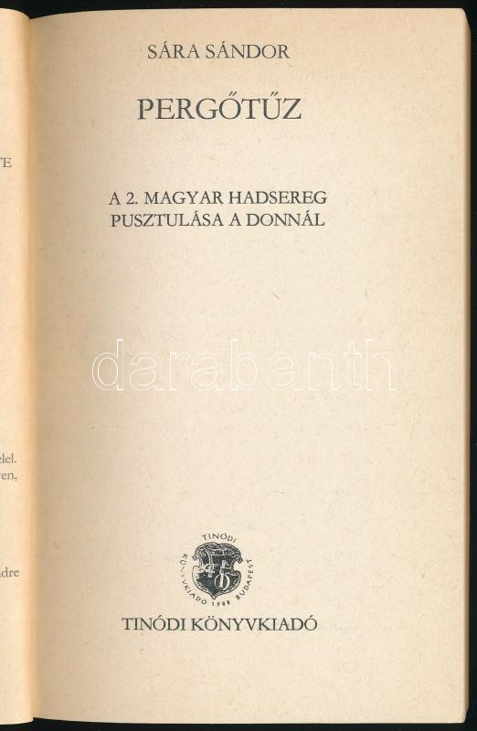Sára Sándor: Pergőtűz. A 2. magyar hadsereg pusztulása a Donnál. Bp., 1988, Tinódi. Első kiadás. Kiadói papírkötés, a hátsó borítón a gerincnél foltokkal.
