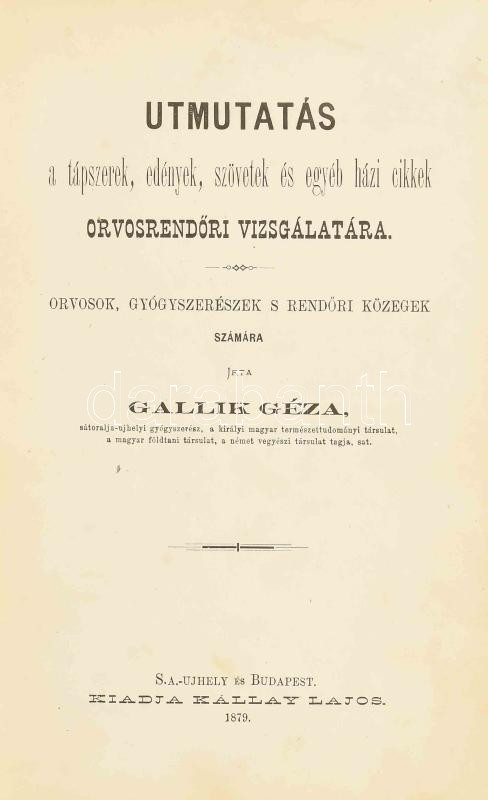 GALLIK Géza: Utmutatás a tápszerek, edények, szövetek és egyéb házi cikkek orvosrendőri vizsgálatára. Orvosok, gyógyszerészek s rendőri közegek számára. Sátoraljaujhely - Bp. 1879. Kállay Lajos. 184 l. 225 mm. A könyvnek két kiadása közül, ez az első különösen ritka. a tartalomból: I. Rész. Tápszerek : Hús, Vadhús, Szárnyas állatok húsa, Halak húsa, Füstölt hús, Kolbászneműek, Tej, Conservált tej, Vaj, Sajt, Savó, Iró, Dizsnózsír, kenyér, Szárított tésztaneműek, czukor, Czukrocskák, szörpök, Méz, Kávé, pergelt őrlött kávé, Pótkávé, Csokoládé, Kakao-vaj, Thea, Főzelék és gyümölcs, Gombák, Fűszerek, Konyhasó, Eczet, Pálinka, liqueur, rum, Bor, Sör, Szénsavas víz, Dohány. Kiadói egészvászon-kötésben.