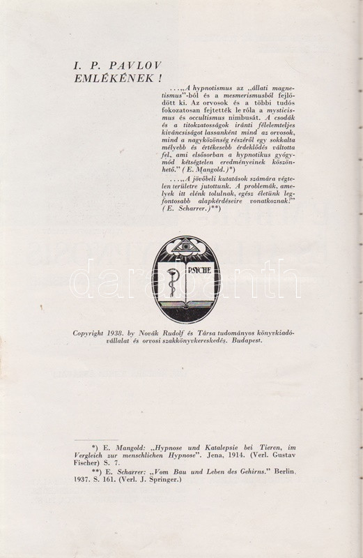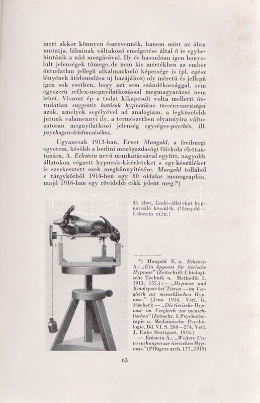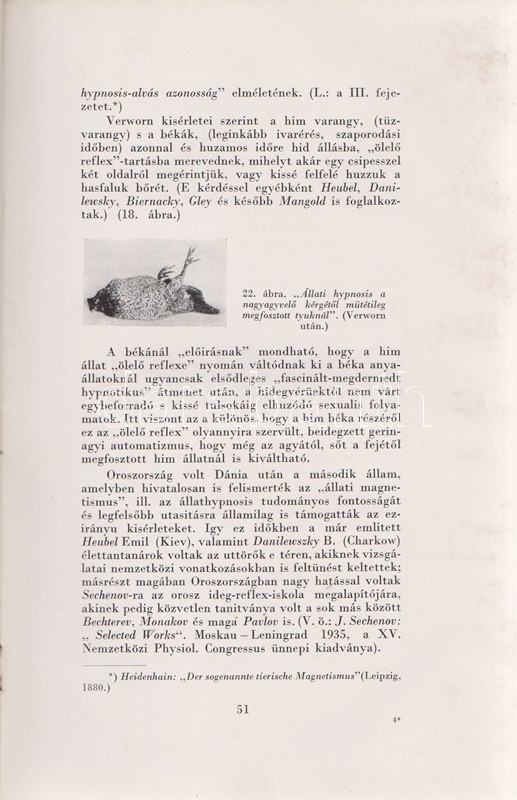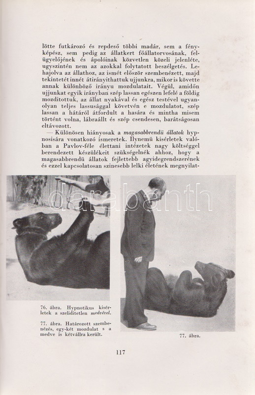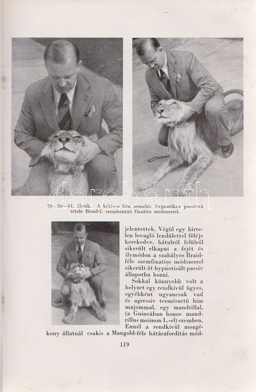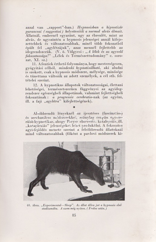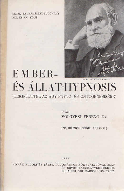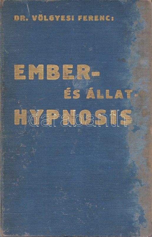 Völgyesi Ferenc: Ember- és állat-hypnosis. Tekintettel az agy phylo- és ontogenesisére. (Dedikált.) Budapest, 1938. Novák Rudolf és Társa Tudományos Könyvkiadóvállalat és Orvosi Szakkönyvkereskedés [ny. n.] 1 t. (hártyapapírral védett címképen a szerző portréja) + 295 + [1] p. Dedikáció a címkép verzóján: ,,Őfensége vitéz József Ferenc királyi herceg úrnak! Legmélyebb hódolatteljes tisztelettel Völgyesi Ferenc okl. ezredorvos. Budapest, 1938". Az oldalszámozáson belül szövegközti felvételekkel és részben színes ábrákkal gazdagon illusztrált kötet legkivált az állati hipnózis és a psziché kondicionálásának kérdéskörével foglalkozik, az állatkísérleteket bemutató kötet képanyagában analóg műszerekre kötött, hipnózisba volt szárnyasok, kutyák, medvék [!] és majomfélék felvételeiben tallózhatunk. A kötet második fele az állati és emberi központi idegrendszer, az agy ontogenezisét vizsgálja, oldalszámozáson belül számos színes szövegközti ábrával. Völgyesi Ferenc hipnotizőr és közhíresség szakmunkája emlékezetes bepillantást nyújt a korszak műszaki segédlettel végzett pszichés kísérletezésének világába, mely feltűnően mellőzi a kísérletezés morális kérdéseit. Néhány oldalon enyhe foltosság, a címkép és a második ív fűzése megerősítve. Az első előzéken régi katalógusszám, a címképet védő hártyapapíron apró hiány. (Lélek- és természettudomány, XIX-XX. szám.) Aranyozott, kötéstábláin foltos kiadói egészvászon kötésben.