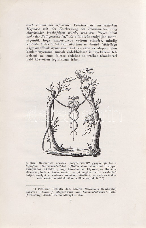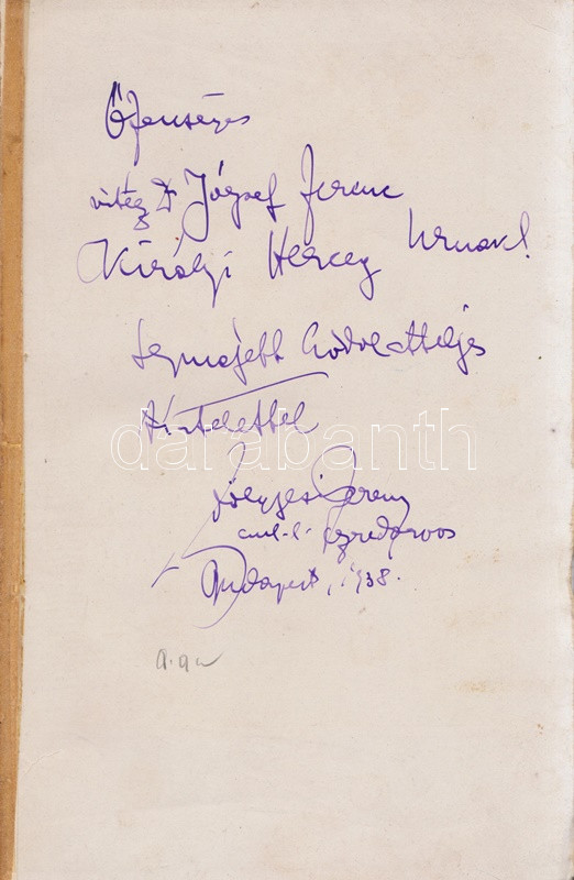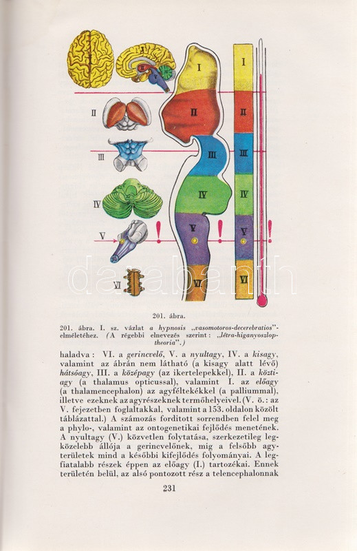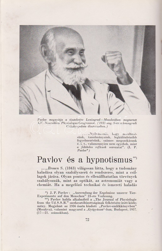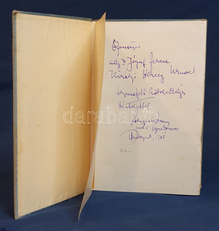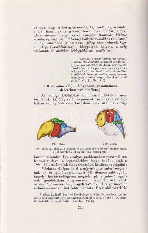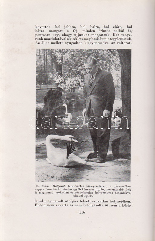 Völgyesi Ferenc: Ember- és állat-hypnosis. Tekintettel az agy phylo- és ontogenesisére. (Dedikált.) Budapest, 1938. Novák Rudolf és Társa Tudományos Könyvkiadóvállalat és Orvosi Szakkönyvkereskedés [ny. n.] 1 t. (hártyapapírral védett címképen a szerző portréja) + 295 + [1] p. Dedikáció a címkép verzóján: ,,Őfensége vitéz József Ferenc királyi herceg úrnak! Legmélyebb hódolatteljes tisztelettel Völgyesi Ferenc okl. ezredorvos. Budapest, 1938". Az oldalszámozáson belül szövegközti felvételekkel és részben színes ábrákkal gazdagon illusztrált kötet legkivált az állati hipnózis és a psziché kondicionálásának kérdéskörével foglalkozik, az állatkísérleteket bemutató kötet képanyagában analóg műszerekre kötött, hipnózisba volt szárnyasok, kutyák, medvék [!] és majomfélék felvételeiben tallózhatunk. A kötet második fele az állati és emberi központi idegrendszer, az agy ontogenezisét vizsgálja, oldalszámozáson belül számos színes szövegközti ábrával. Völgyesi Ferenc hipnotizőr és közhíresség szakmunkája emlékezetes bepillantást nyújt a korszak műszaki segédlettel végzett pszichés kísérletezésének világába, mely feltűnően mellőzi a kísérletezés morális kérdéseit. Néhány oldalon enyhe foltosság, a címkép és a második ív fűzése megerősítve. Az első előzéken régi katalógusszám, a címképet védő hártyapapíron apró hiány. (Lélek- és természettudomány, XIX-XX. szám.) Aranyozott, kötéstábláin foltos kiadói egészvászon kötésben.