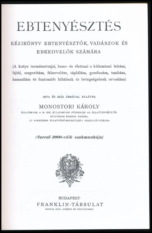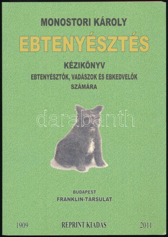 Monostori Károly: Ebtenyésztés kézikönyv ebtenyésztők, vadászok és ebkedvelők számára. (A kutya természetrajzi, bonc- és élettani s küllemtani leírása, fajtái, szaporítása, felnevelése, táplálása, gondozása, tanítása, használása és fontosabb hibáinak és betegségeinek orvoslása.) Bp.,2011, Lapu Bt., 196 p. Szövegközti képekkel illusztrált. Az 1909-es Franklin kiadás REPRINT kiadása! Kiadói papírkötésben.