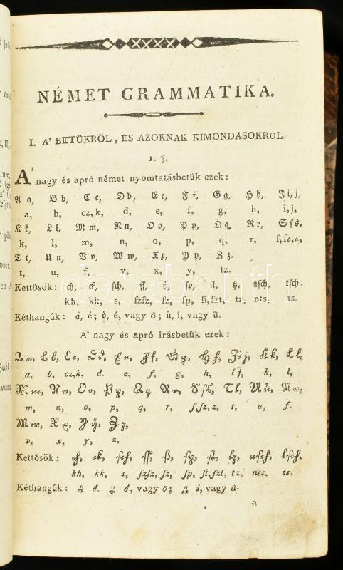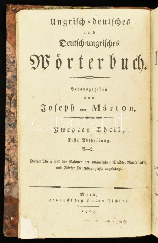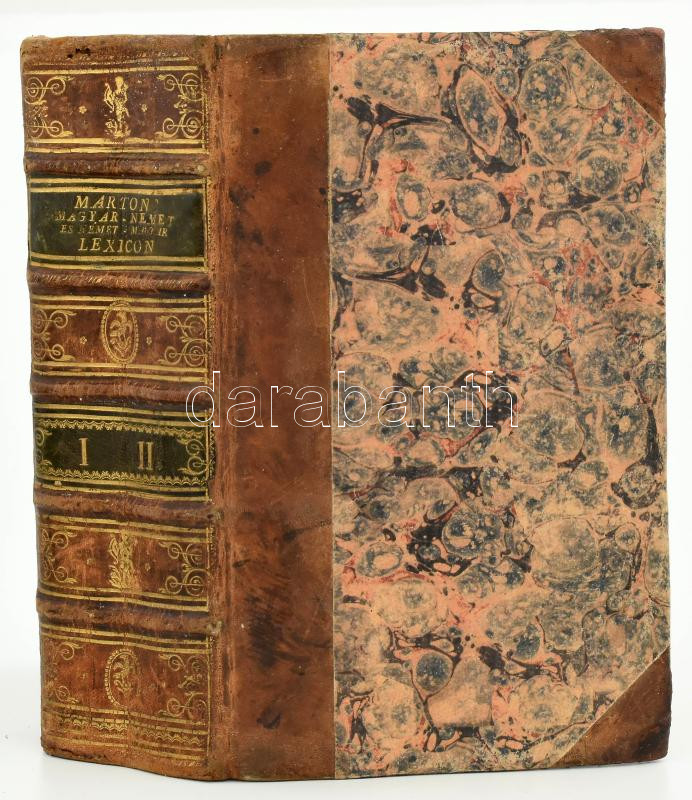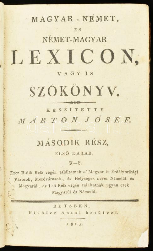 Márton József: Magyar-német és német-magyar lexicon, vagyis szókönyv. Készítette: - -. Második rész, első darab. A-Z. [A teljes Német-magyar rész.] Béts, 1803, Pichler József, 2+VIII+48+1204 [kéthasábos számozás] +2+1018 [kéthasábos számozás]+11+24 p. Korabeli aranyozott, bordázott gerincű félbőr-kötés, a borítón kopásnyomokkal, két lap sarkán restaurációval, egy lap sarkán apró hiánnyal.