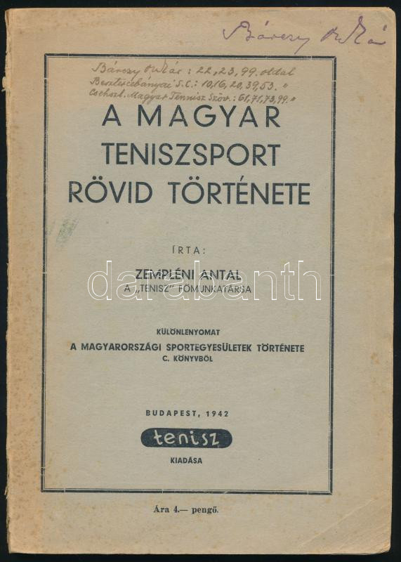 Zempléni Antal: A magyar teniszsport rövid története. DEDIKÁLT! Különlenyomat a Magyarországi sportegyesületek története c. könyvből. Bp., 1942, Tenisz. Kiadói papírkötés, a borítón bejegyzéssel, kissé foltos borítóval, kissé sérült gerinccel.