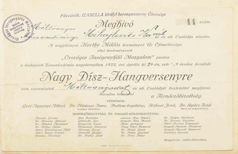 1923 Bp., az Országos Inségenyhítő Mozgalom javára a Zeneakadémia nagytermében rendezett Nagy Díszhangerverseny műsora + meghívó Mihajlovits (Mihailovits, Michailovits) Kornél részére, számozott (44. sz.)
