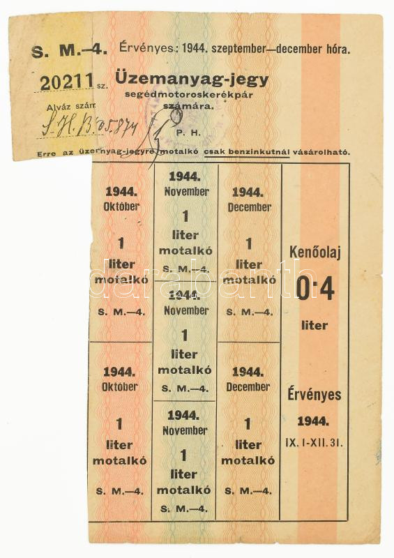 1944 Üzemanyag-jegy segédmotorkerékpár számára, részben felhasznált (v... https://www.darabanth.com/de/464-Fernauktion/464.0/Kunst-Dokumente-andere-Sammelgebiete/Dokument~1000020/1944-Uzemanyag-jegy-segedmotorkerekpar-szamara-reszben-felhasznalt-vagott-hajtasnyommal-apro~II3129913