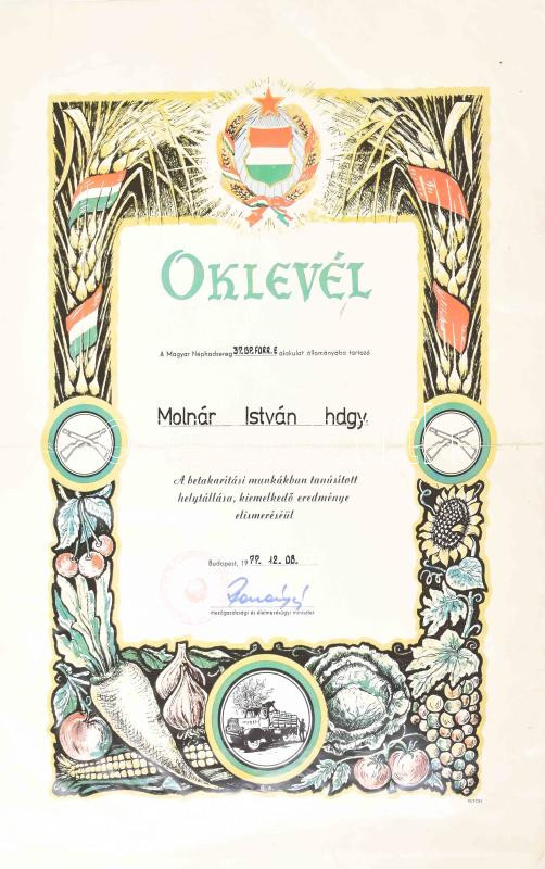1977 Mezőgazdasági munkában segítő katonai oklevél, miniszteri aláírás... https://www.darabanth.com/de/464-Fernauktion/464.0/Kunst-Dokumente-andere-Sammelgebiete/Dokument~1000020/1977-Mezogazdasagi-munkaban-segito-katonai-oklevel-miniszteri-alairassal-hajtott~II3126200