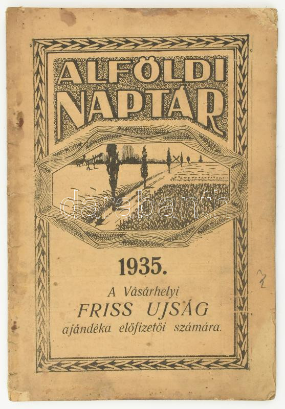 1935 Alföldi Naptár az 1935. közönséges esztendőre. A Vásárhelyi Friss Ujság ajándéka előfizetői részére, 1855. Burger Zsigmond. VIII+148+IV p. Későbbi egészvászon kötés, kissé kopottas állapotban, kissé sérült borítóval, erlső néhány lap jobb felső sarkában kissé sérült két jegyzetelésre szánt lap vágott vagy kivágva.