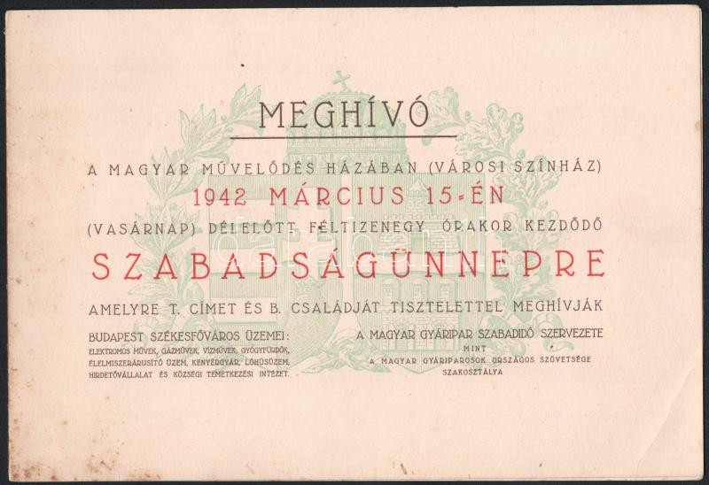 Beschreibung: 1942 Bp., Meghívó a Magyar Művelődés Házában 1942. március 15-én rendezett szabadságünnepre, műsorral, kissé foltos, 2 sztl. lev.
