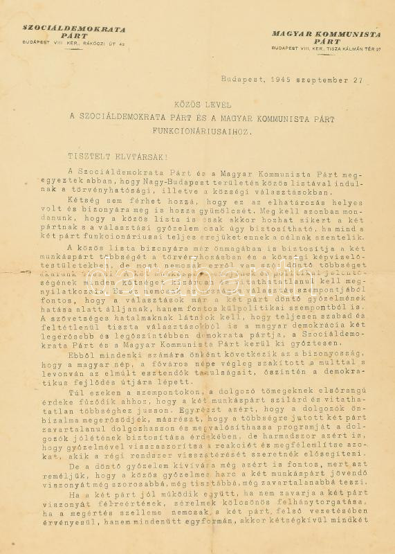 1945.IX.27. Közös levél a Szociáldemokrata Párt és a Magyar Kommunista Párt funkcionáriusaihoz, Szakasits Árpád és Rákosi Mátyás nyomtatott aláírásaival. Bp., Világosság-ny., 2 p. Kisebb lapszéli szakadásokkal, minimálisan foltos.