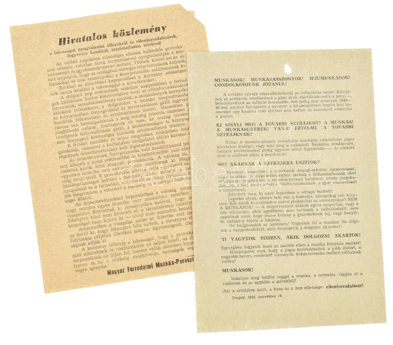1956 röplapok, 2 db, egyik Szeged, másik Budapest https://www.darabanth.com/de/464-Fernauktion/464.0/Kunst-Dokumente-andere-Sammelgebiete/Drucksachen~1500012/1956-roplapok-2-db-egyik-Szeged-masik-Budapest~II3112250
