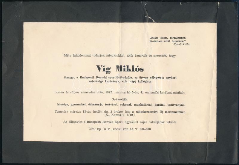 Beschreibung: 1972 Víg Miklós őrnagy, a Bp. Honvéd sportlövő-edzője, az öttusa-válogatott egykori szövetségi kapitányának halotti értesítője