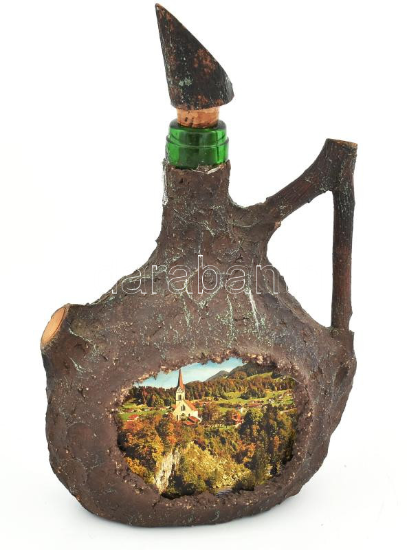 Beschreibung: Tájképpel díszített zöld üvegkulacs, fakéregszerű bevonattal, faág fogóval, dugóval. 0,7 l, m: 27,5 cm