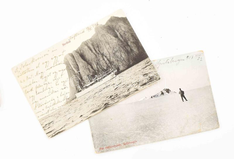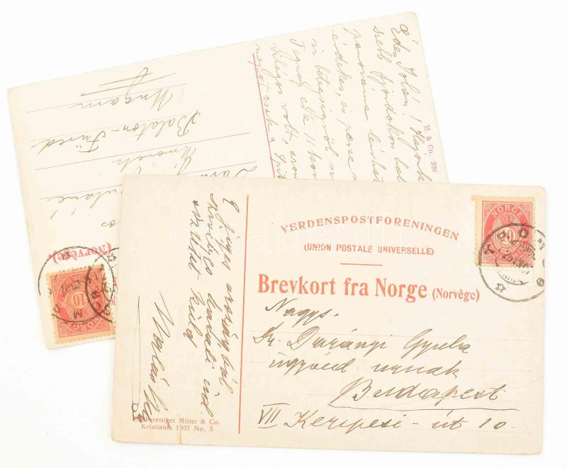 1907 Darányi Gyula ügyvédnek (1862-1931), Darányi Kálmán későbbi miniszterelnök rokonának által küldött 2 képeslap Norvégiából, egyiken érdekes tartalommal: "(...) én sütöttem el egy ágyút az Oszt. Magy. Monarchia nevében (...)", másik szakadással