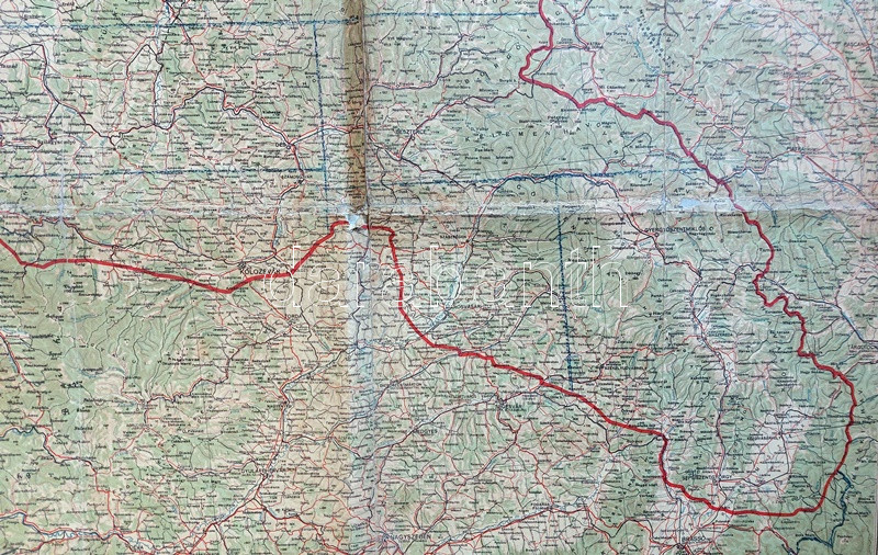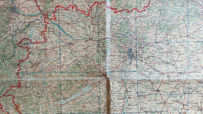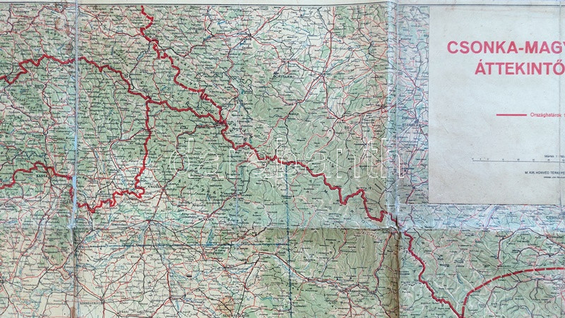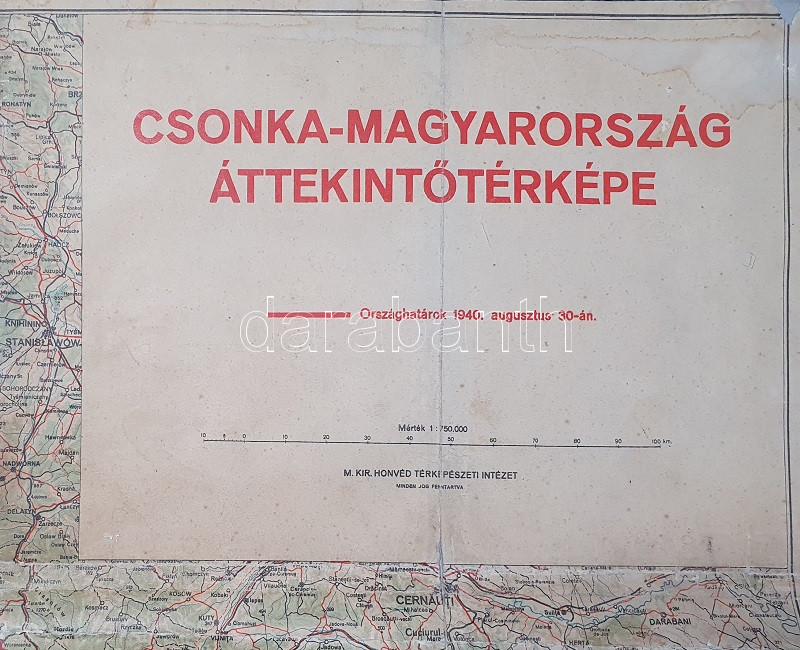 Csonka-Magyarország áttekintő térképe az 1940. augusztus 30-a után érvényes határokkal. Mértéke: 1 : 750.000. [Budapest], 1940. M. Kir. Honvéd Térképészeti Intézet. Színes térkép, mérete: 810x1090 mm egy 820x1110 mm méretű térképlapon. Térképünk az Észak-Erdélyt visszajuttató, 1940. augusztus 30-i második bécsi döntés utáni országhatárokat mutatja. Az egykori tulajdonos kék vonallal behúzta az ország történelmi határvonalát, illetve pirossal az 1941. áprilisi délvidéki bevonulás után megállapított határvonalakat, egyetlen apró tévedéssel, a Dunától keletre fekvő Nyugat-Bánát esetén a kézzel rajzolt határvonal téves, a jelentős sváb lakosság által lakott terület végig német katonai közigazgatás mellett a megszállás alatt álló Szerbia része maradt. A tulajdonos kék színnel a kibővült ország területeit ismeretlen rendszer szerint téglalap alakú részekre osztotta. Jó állapotú térképlap, hajtogatva, vászonra vonva.