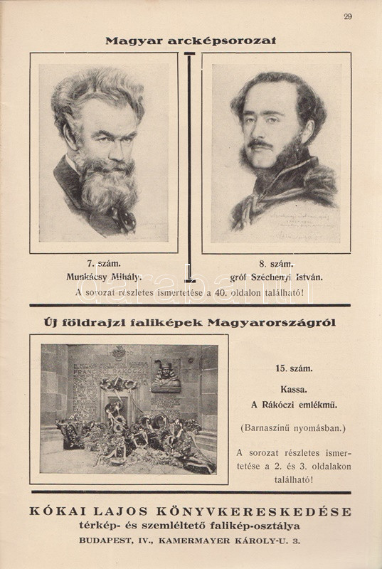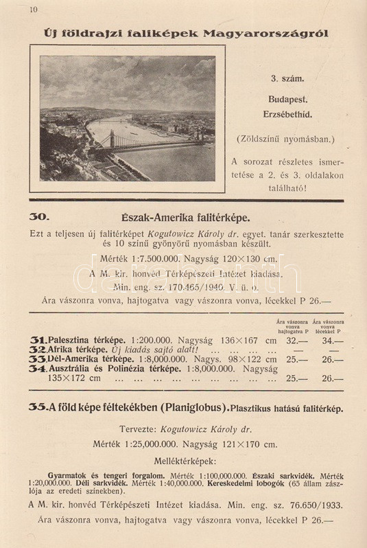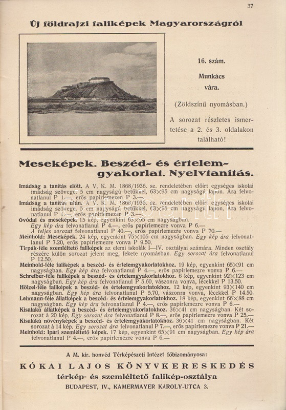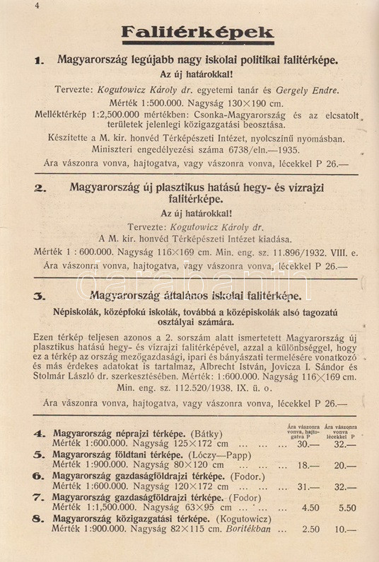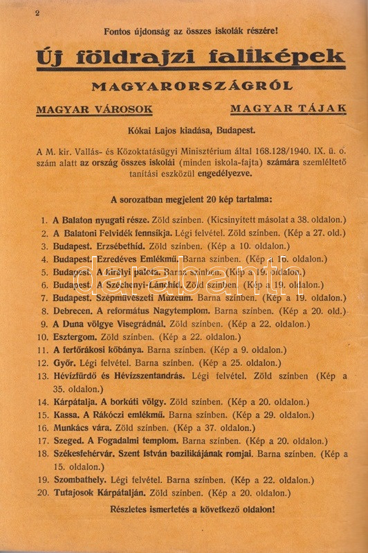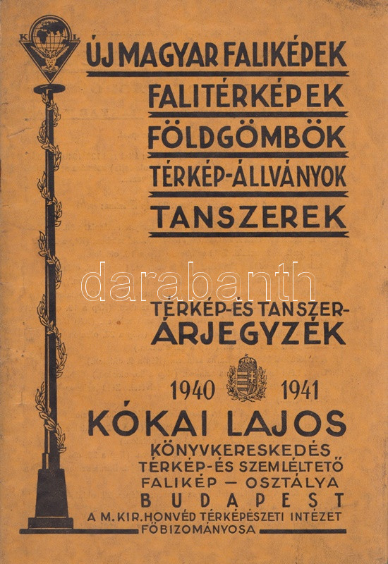 Új magyar faliképek, falitérképek, földgömbök, térkép-állványok, tanszerek. Kókai Lajos könyvkereskedő térkép- és tanszer-árjegyzéke. (1940-1941). Budapest, 1940. Kókai Lajos (,,Élet" Irodalmi és Nyomda Rt.) 40 p. Kókai Lajos új tanszer-katalógusának friss tétele a határmódosulások nyomán a földrajzi faliképek közé kerülő kárpátaljai és felvidéki képek sora. Oldalszámozáson belül gazdag szövegközti illusztrációs anyaggal. Fűzve, illusztrált, halványan foltos kiadói borítóban.