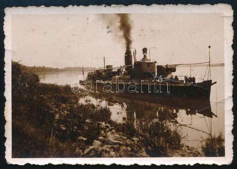 Beschreibung: cca 1930 Katonai monitor Bajánál, fotó, kisebb sérülésekkel, 6×9 cm