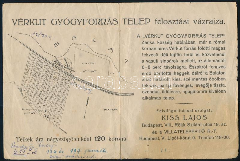 cca 1920 Vérkut gyógyforrás telep (Zánka) felosztási vázrajza, tájékoz... https://www.darabanth.com/de/464-Fernauktion/464.0/Kunst-Dokumente-andere-Sammelgebiete/Werbungen~1500001/cca-1920-Verkut-gyogyforras-telep-Zanka-felosztasi-vazrajza-tajekoztato-reklamlap-hajtva-~II3126187
