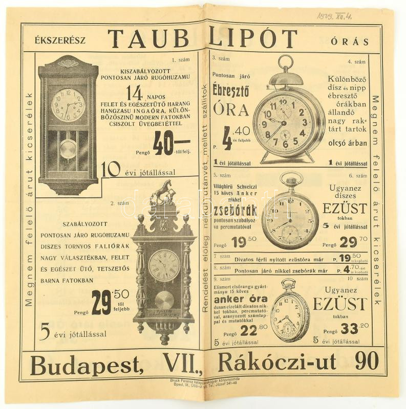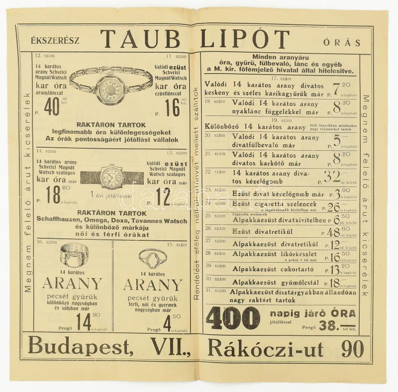 cca 1929 Taub Lipót ékszerész, órás prospektus árjegyzéke, hajtásnyomm... https://www.darabanth.com/de/464-Fernauktion/464.0/Kunst-Dokumente-andere-Sammelgebiete/Werbungen~1500001/cca-1929-Taub-Lipot-ekszeresz-oras-prospektus-arjegyzeke-hajtasnyommal-31x31-cm~II3129757