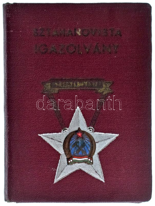 1951. "Sztahanovista" kitüntetés igazolványa, külső borítóján zománcoz... https://www.darabanth.com/de/464-Fernauktion/464.0/Numismatik/Faleristik-Auszeichnungen-Medaillen-Orden~500020/1951-Sztahanovista-kituntetes-igazolvanya-kulso-boritojan-zomancozott-fem-Rakosi-cimerrel-T-XF~II3127006