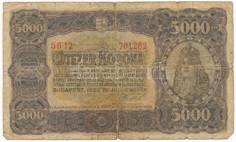 1923. 5000K "5 B12 701262", "Magyar Pénzjegynyomda Rt. Budapest" nyomd... https://www.darabanth.com/de/464-Fernauktion/464.0/Numismatik/Ungarische-Banknoten~500008/1923-5000K-5-B12-701262-Magyar-Penzjegynyomda-Rt-Budapest-nyomdahely-jelolessel-T-VG~II3124327