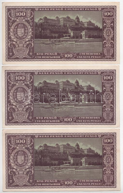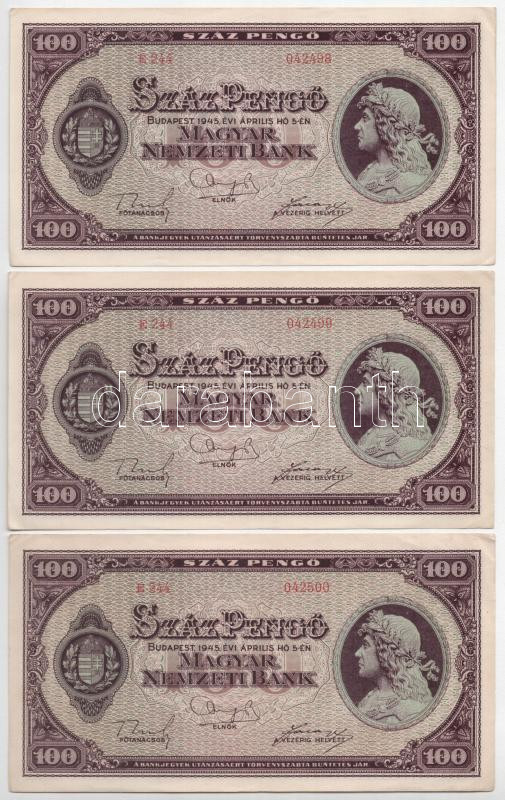 1945. 100P (3x) sorszámkövetők "E 244 042498 - E 244 042500" T:AU saro... https://www.darabanth.com/de/464-Fernauktion/464.0/Numismatik/Ungarische-Banknoten~500008/1945-100P-3x-sorszamkovetok-E-244-042498-E-244-042500-T-AU-sarokhajlas-Adamo-P18~II3124278