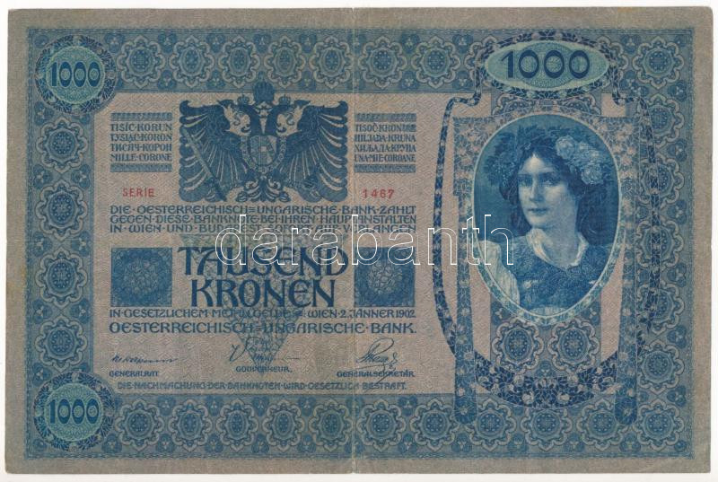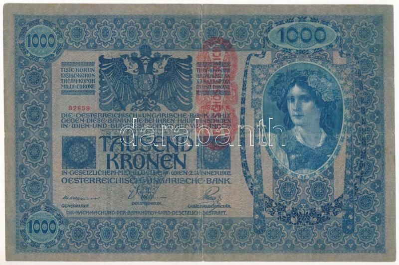 Ausztria 1919. (1902.) 1000K mindkét oldal német, piros "DEUTSCHÖSTERREICH" függőleges felülbélyegzéssel T:F Austria 1902. 1000 Kronen both sides German, with red "DEUTSCHÖSTERREICH" vertical overprint C:F