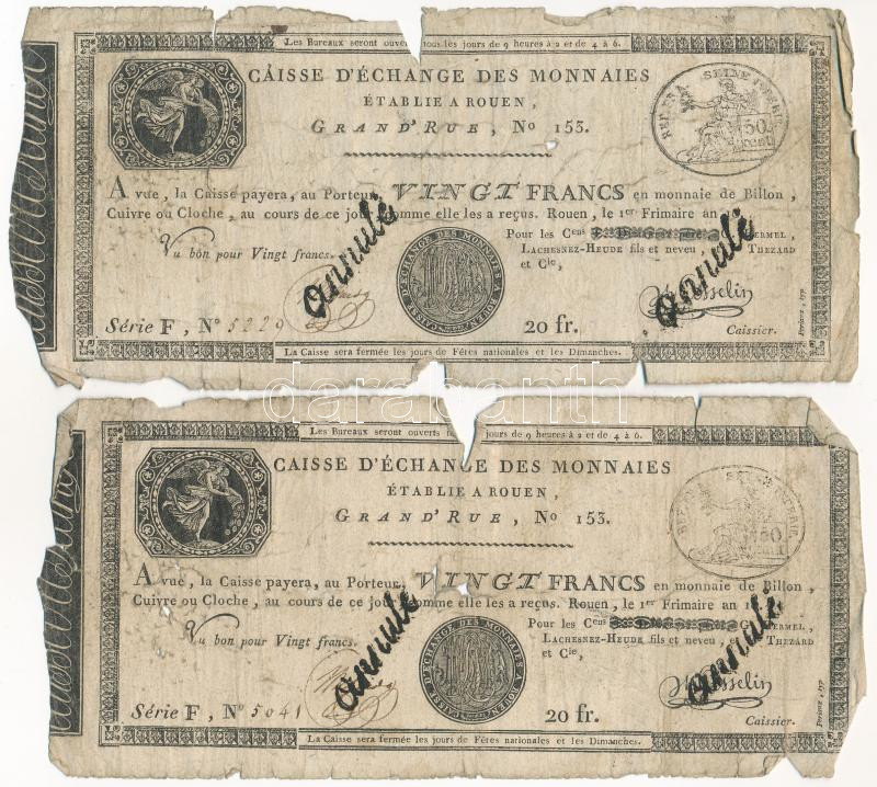 Beschreibung: Franciaország / Rouen 1797-1803. 20Fr "annulé (érvénytelen)" felülbélyegzéssel (2x) T:G France / Rouen 1797-1803. 20 Francs "annulé (cancelled)" (2x) C:G Krause P#S245a