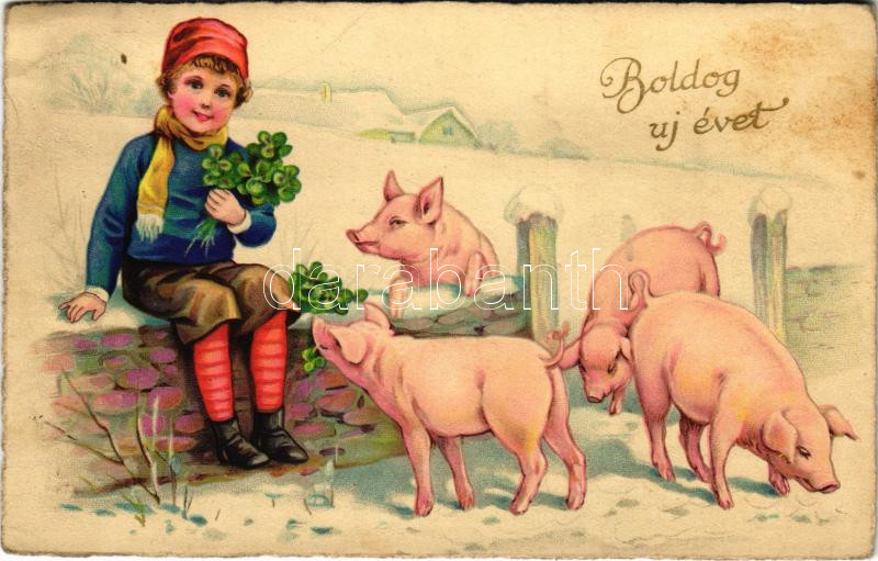 1934 Boldog új évet. malacok / New Year greeting, pigs. Amag 4054. lit... https://www.darabanth.com/de/465-Fernauktion/465.0/Ansichtskarten/GruC39Fkarten-Feste~1500084/1934-Boldog-uj-evet-malacok-New-Year-greeting-pigs-Amag-4054-litho-EK~II3137079