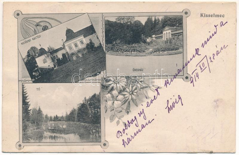 1914 Kisselmec, Liptókisselmec, Kisschelmecz, Sztiavnicska, Stiavnicka (Turóc); Révay báró kastély, üvegház, tó / castle, greenhouse, pond. Art Nouveau, floral (ázott / wet damage)