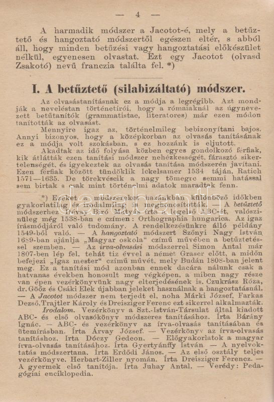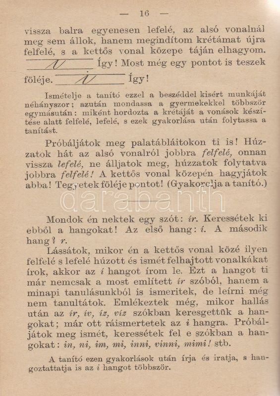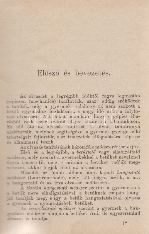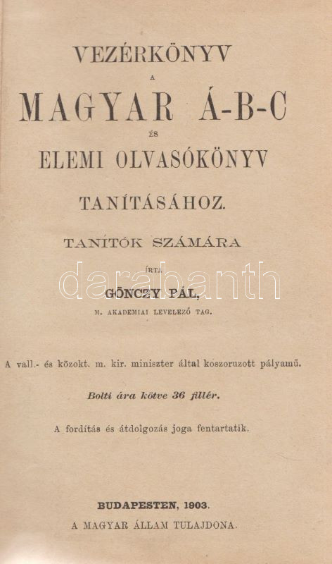 Gönczy Pál: Vezérkönyv a magyar á-b-c és elemi olvasókönyv tanításához. Tanítók számára. A vallási és közoktatási m. kir. miniszter által koszoruzott pályamű. Budapest, 1903. (M. Kir. Egyetemi Nyomda). 111 + [1] p. Gönczy Pál (1817-1892) pedagógus, református művelődésszervező, iskolaalapító, a Magyar Tudományos Akadémia Tagja, a vallás- és közoktatási minisztérium államtitkárának elemi iskolai tanári kézikönyve több előtanulmány után először 1869-ben jelent meg. A szövegközti ábrákkal kísért pedagógiai kézikönyv emlékezetes betekintést nyújt az írásoktatás századközepi retorikájába és stratégiájába. Korabeli, sérült gerincű papírkötésben, a gerincen enyhén hiányos papírcsíkkal erősítve.