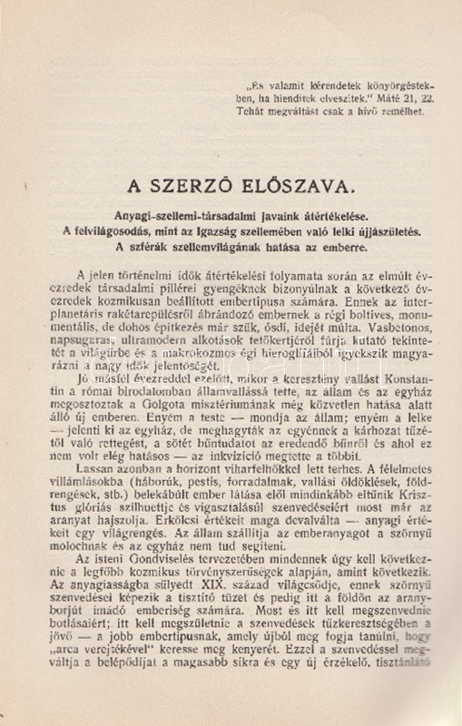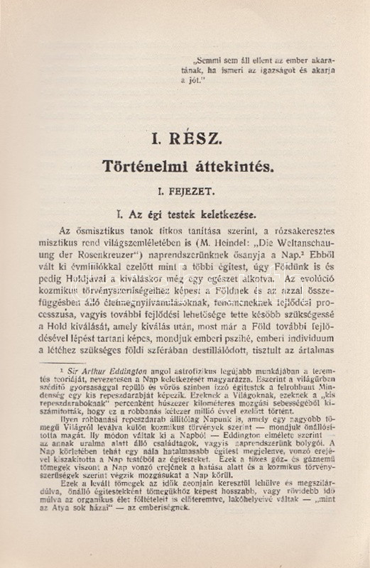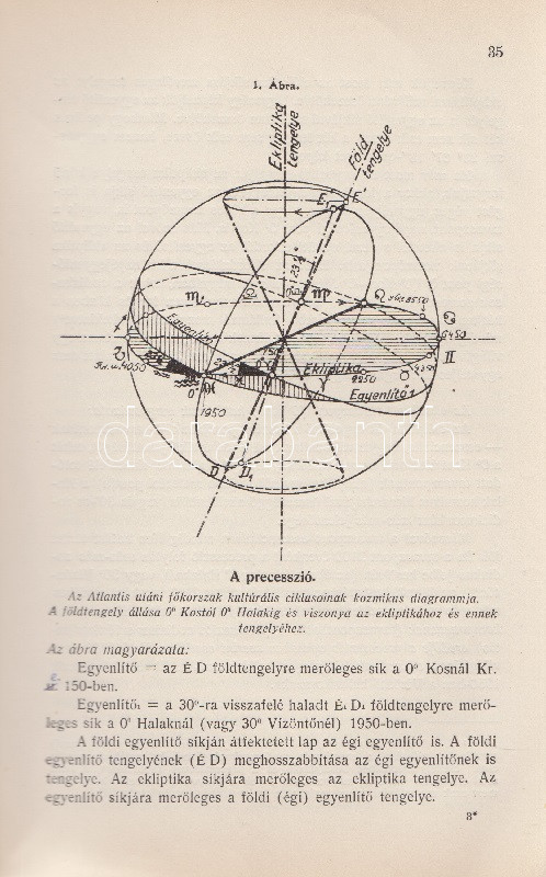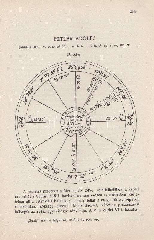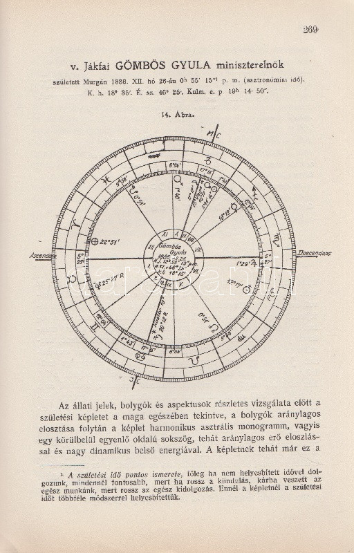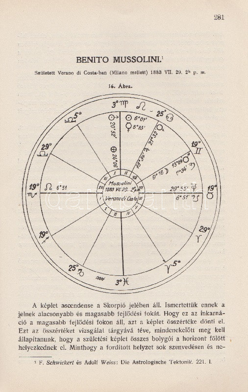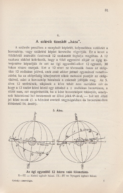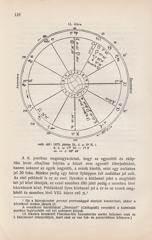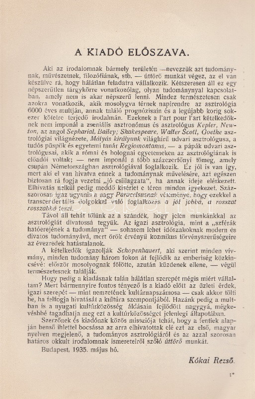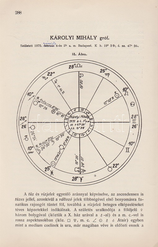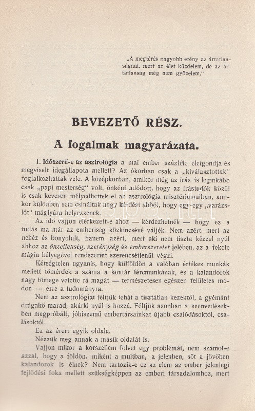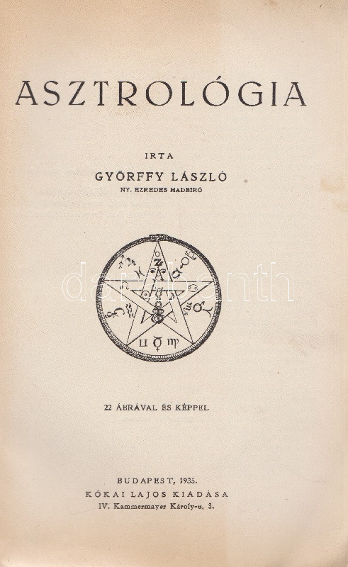 Győrffy László: Asztrológia. 22 ábrával és képpel. Budapest, 1935. Kókai Lajos kiadása (Buschmann F. utódai ny.) 319 + [1] p. + 2 t. Első kiadás. Oldalszámozáson belül gazdag szövegközti illusztrációs anyaggal. A kötetet a Protestáns Szemlében Hamvas Béla recenzeálta: ,,Teljesen függetlenül attól a kérdéstől, ami ezzel a könyvvel kapcsolatban felmerülhet, hogy vajon nem sajátságos visszaesés jele-e, ha ma az asztrológiát ismét komolyan kezdik venni, figyelembe kell venni azt a tényt, hogy a mai tudomány sok igen előkelő képviselője, egy Dacqué, Keyserling, Driesch, Verwegen félreérthetetlen rokonszenvvel fordul feléje. Már tizenöt-húsz évvel ezelőtt igazolódott néhány alapvető mű hatása alatt, hogy itt nem a régi babonáról és sarlatánizmusról van szó, hanem - legalábbis komoly képviselői kezében - a tudomány egyik kritériumát kimeríti: az igazságot keresi. A maga módján természetesen, de keresi. Nálunk Győrffy László könyve az első ilyen komoly és tudományos asztrológia. Előnye tehát, hogy teljesen friss talajon jár, hátránya, hogy a ki nem alakult terminológia miatt nagy nehézségeket kell leküzdenie. A könyve világosan, érthetően ismerteti az asztrológia történetét, lényegét, felépítését, sajátságos igazságait, technikáját. Legnagyobb részt kénytelen is ebben kimerülni. Mint úttörőnek elölről kell kezdenie, és az alapfogalmakat kell megmagyaráznia. A második rész közepén, ahol a prognózist kezdi tárgyalni, válik el azoktól a tankönyvektől, amilyenek nyugati nyelveken már elég szép számmal vannak. És itt kezd kibontakozni a szerző speciális asztrológiai problematikája. A mű középponti magja és filozófiai alapgondolata tulajdonképpen a modern asztrológia egyik legkényesebb pontja: a determináció kérdése. Az asztrológia nem folytatása annak a természettudománynak, amely lassan-lassan teljesen felszámolta az emberi akaratot és beleolvasztotta fajba, fiziológiai alkatba, konstitúcióba, öröklött lelki tulajdonságokba, és addig magyarázta az emberi akaratot, amíg végre eltűnt, hanem egy újfajta determináció-tant alakított ki, amely nem az anyagi világból, hanem a kozmikus erőkből vezeti le az emberi akaratot. Végül közéletünk néhány vezető egyéniségének horoszkópját állítja fel. Példát mutat a tökéletes és pontos születési képletek felállítására és megfejtésére és eredményeit mindjárt a közönség elé is bocsátja, hogy ellenőrizze, ami benne a valóságnak megfelelő". Hamvas Béla nem nevesíti a horoszkópi módszerrel vizsgált életutakat: a kötet Gömbös Gyula, Habsburg József Ferenc, Benito Mussolini, Adolf Hitler, Károlyi Mihály és Richard Wagner sorsképletét elemzi, valamint a tragikus véget ért ,,Justice for Hungary" repülő légiútjának sorsképletét. Néhány oldalon oldalszéli jegyzetek, kézi javítások. Fűzve, korabeli papírborítóban.