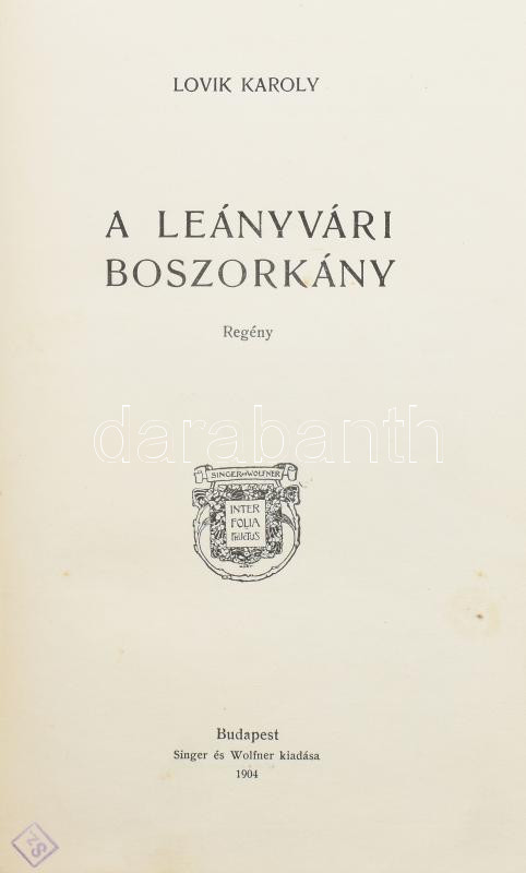 Lovik Károly: A leányvári boszorkány. Regény. Bp., 1904, Singer és Wolfner. Kiadói szecessziós egészvászon-kötés, Gottermayer-kötés, a borítón kis kopásnyomokkal.