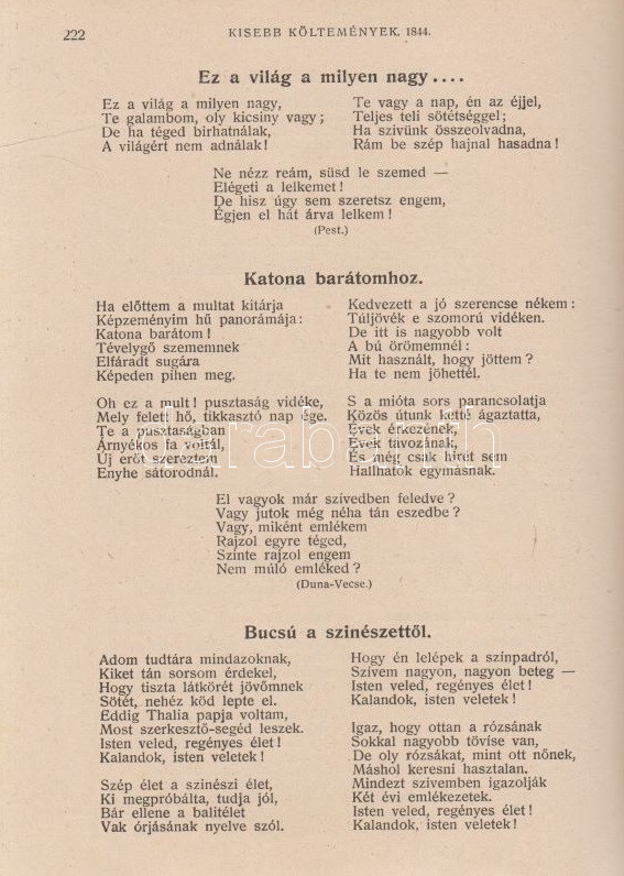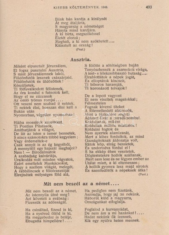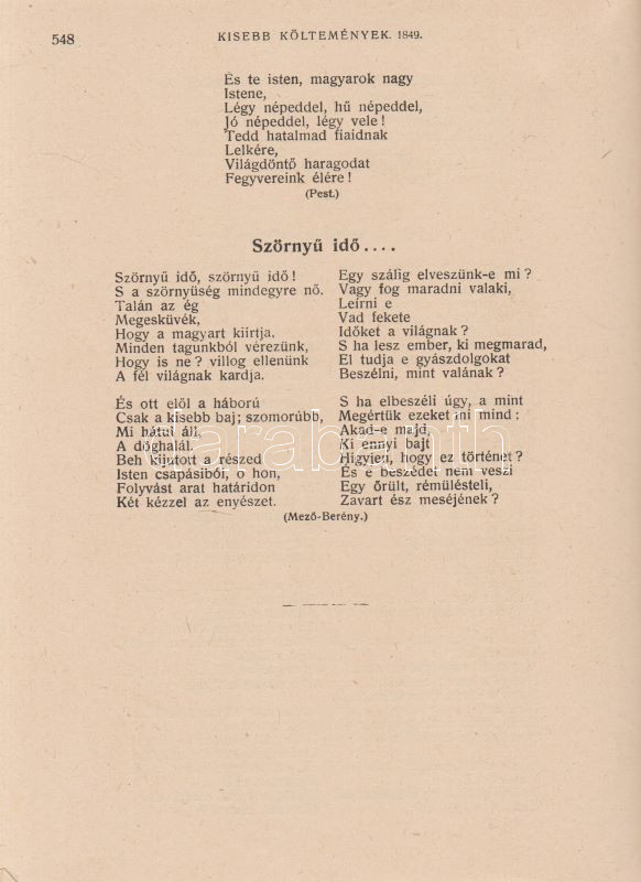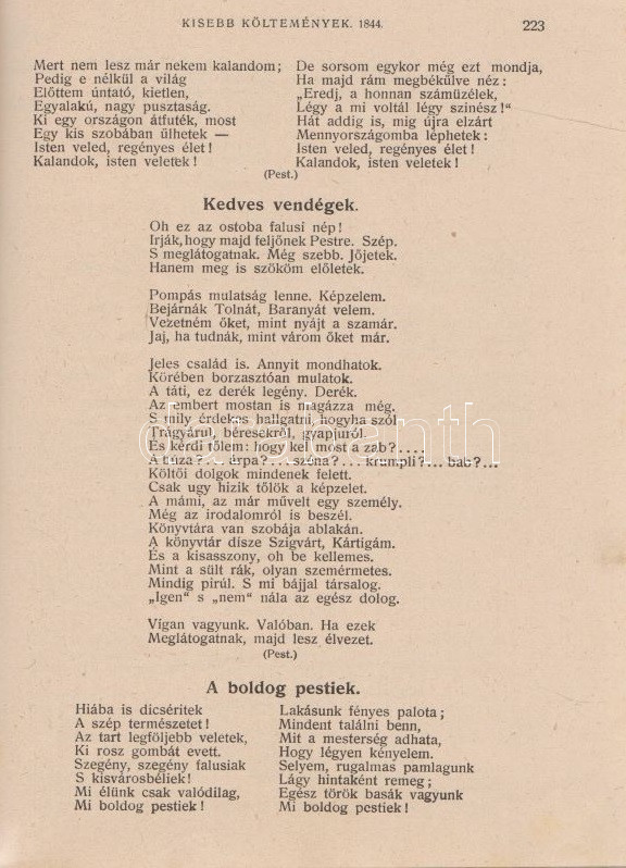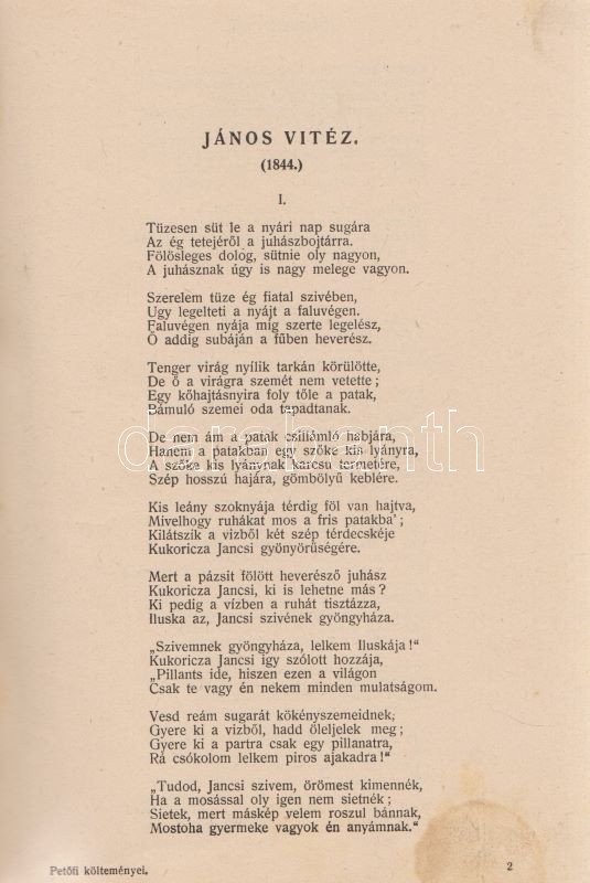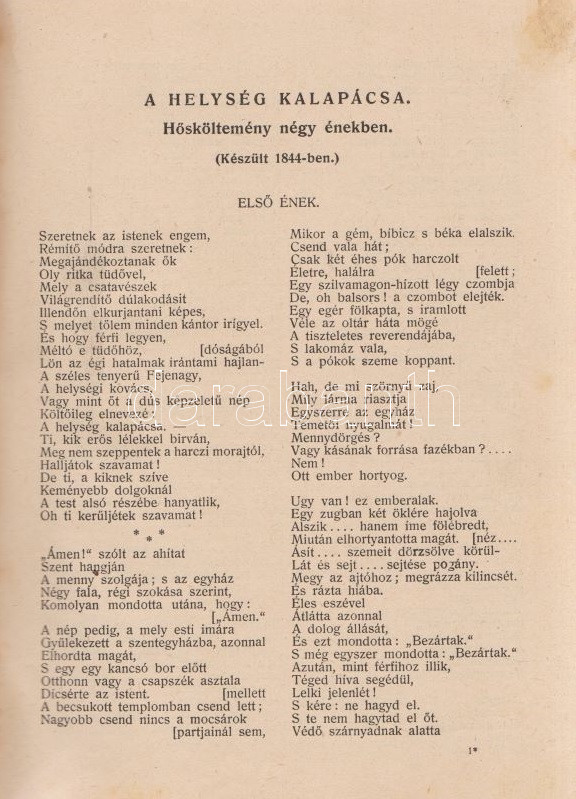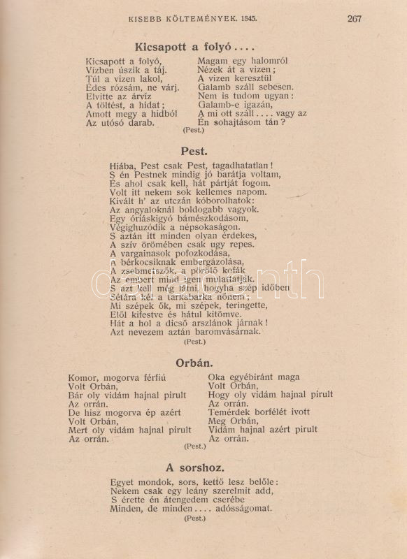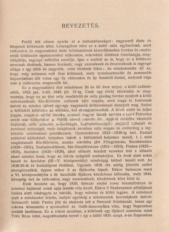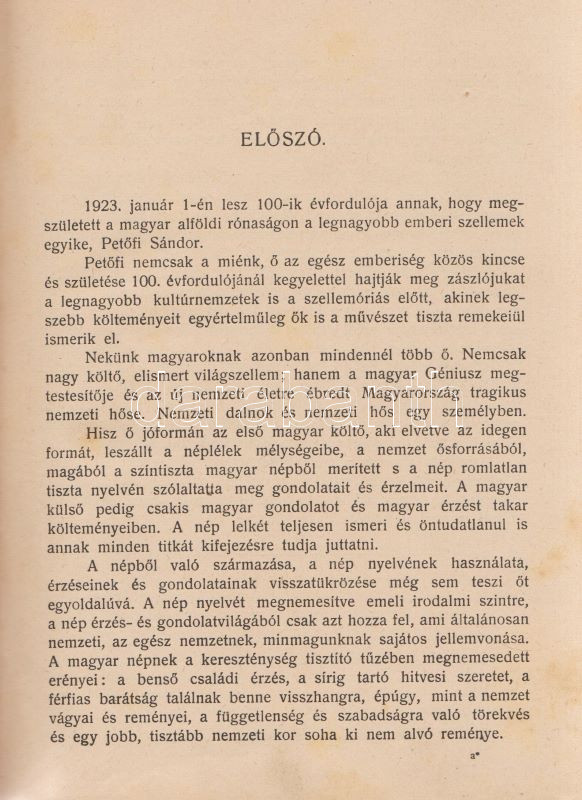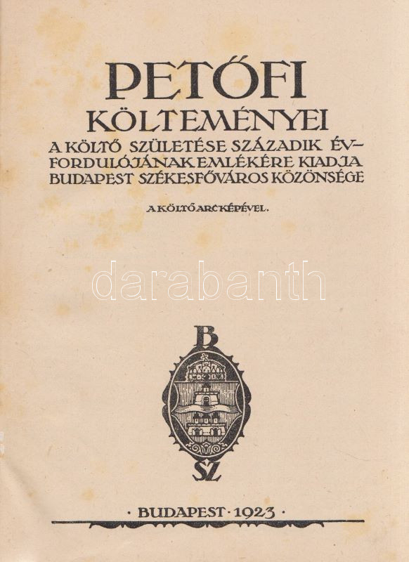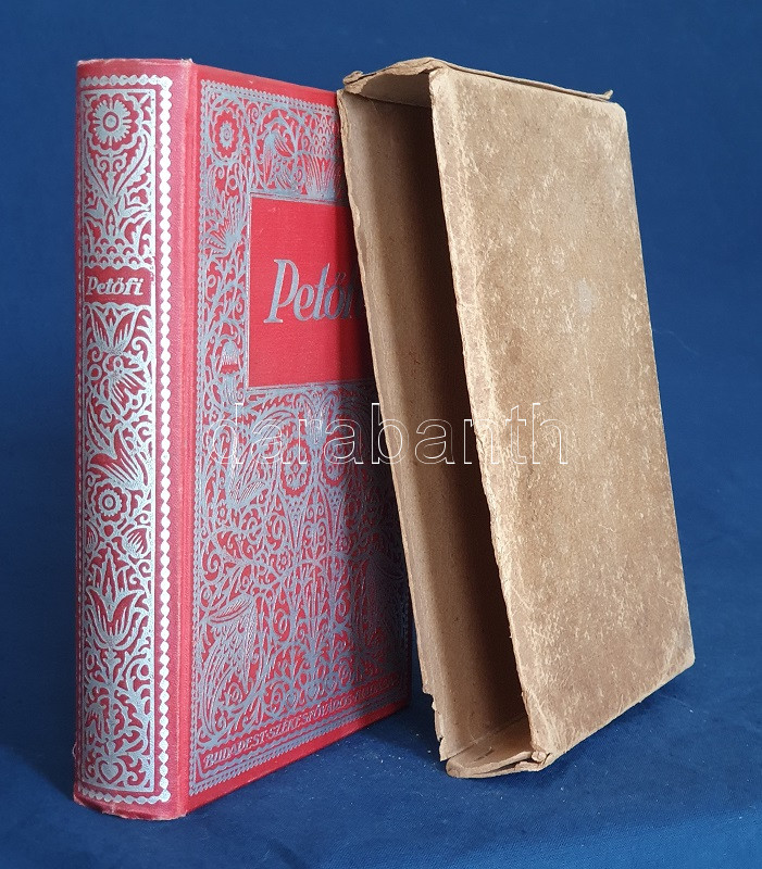 PetÅ‘fi Sándor: PetÅ‘fi költeményei. A költÅ‘ születése századik évfordulójának emlékére. A költÅ‘ arcképével. Budapest, 1923. Budapesti SzékesfÅ‘város közönsége (ny.) 1 t. (cÃmkép) + XI + [1] + 626 p. A jubileumi verseskötet PetÅ‘fi lÃráját és elbeszélÅ‘ költészetét közli, a kötet elÅ‘szavát SipÅ‘cz JenÅ‘, bevezetését Ferenczi Zoltán jegyzi. A kötet élén a leghangsúlyosabbnak Ãtélt rész: ,,ElbeszélÅ‘ költemények 1844-1849" cÃmmel, melyet PetÅ‘fi érett lÃrája követ ,,Kisebb költemények 1842-1849" név alatt, majd a zsengék következnek ,,Ifjúsági kÃsérletek 1838-1842" beosztás szerint, végül ,,A költÅ‘ által kihagyott költemények 1842-1849" cÃmű rész zárja a kötetet. A népszerű kötet jegyzetapparátust nem tartalmaz. Dúsan ezüstözött, vaknyomásos kiadói egészvászon kötésben, kiadói tokban.