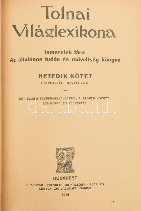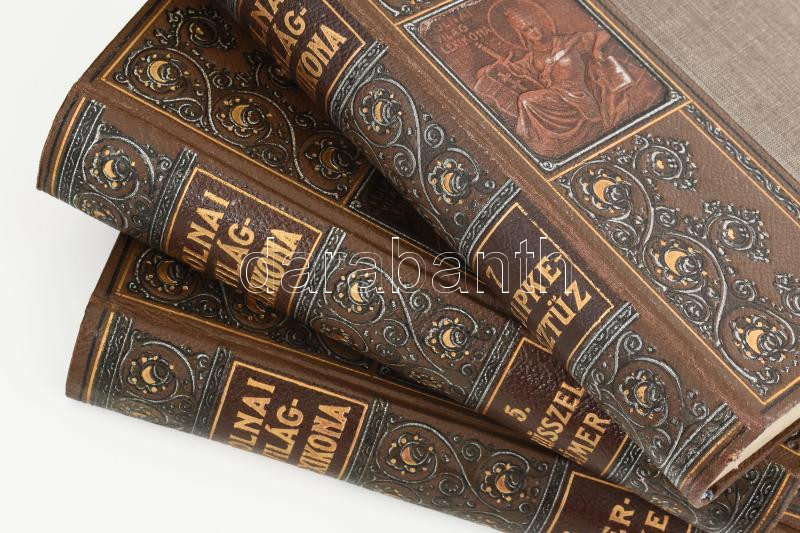 Tolnai Világlexikona 1-7. köt. Bp., 1912-1916., Magyar Kereskedelmi Közlöny. Egy kötet hiánnyal. Kiadói szecessziós aranyozott félbőr-kötés, fémplakettekkel díszített elülső táblákkal, kisebb hibákkal, a borítón kis foltok, kopásnyomokkal, apró sérülések, de ezektől eltekintve jó állapotban.