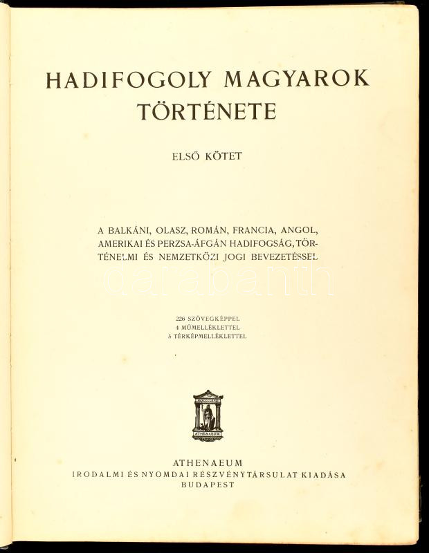 Hadifogoly magyarok története. Szerk.: Baja Benedek - Pilch Jenő - Lukinich Imre - Zilahy Lajos. 1-2. köt. Bp., [1930], Athenaeum. Gazdag képanyaggal illusztrált. Kiadói egészvászon-kötésben, kissé sérült gerinccel, kopott borítóval, kihajtható térképek nélkül, I. kötetben lapszéli ázásfoltokkal; II. kötet kötése laza, első néhány lap kissé foltos és szélén apró szakadásokkal.