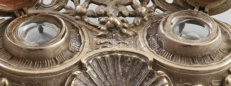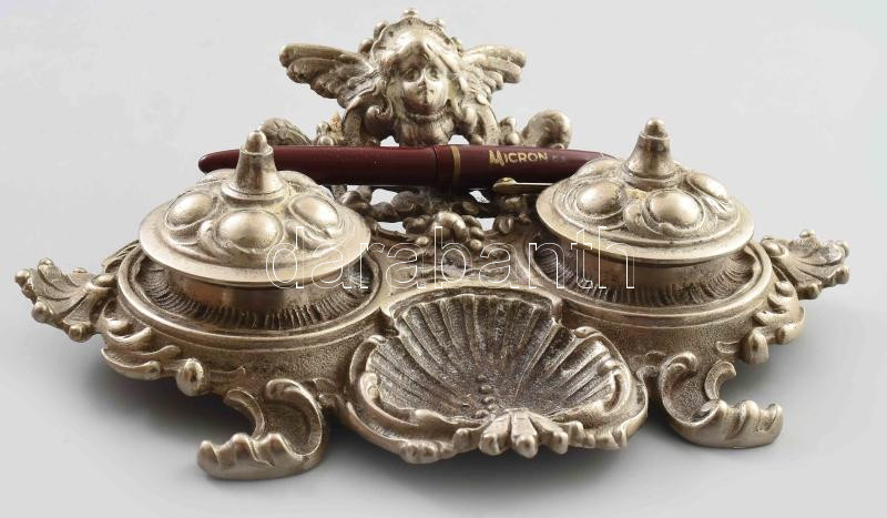 Beschreibung: Antik vas kalamáris. Angyalfigura díszítéssel, kissé pattogzott üveg tégelyekkel, tollal, jó állapotban, 24x17 cm